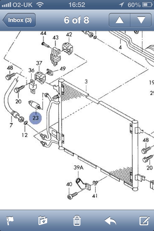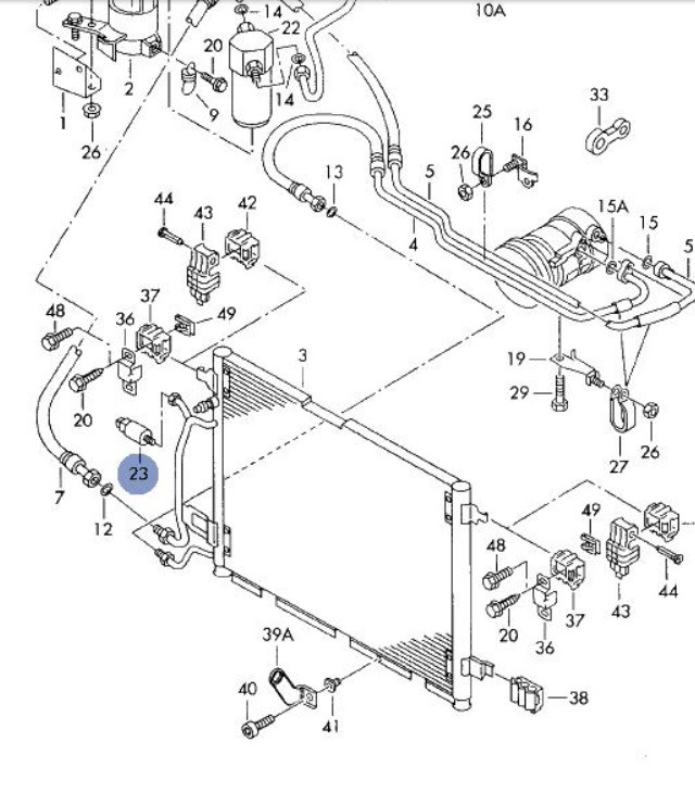 Also the very helpful man at Audi sent me an exploded diagram of the A/C system which I'll put up as well. Looking at the diagram it looks like the switch is sitting left of the condenser (driver side) ... but on my car it was on the right side of the condenser (passenger side) go figure? Anyway everything is working fine and I'm happy