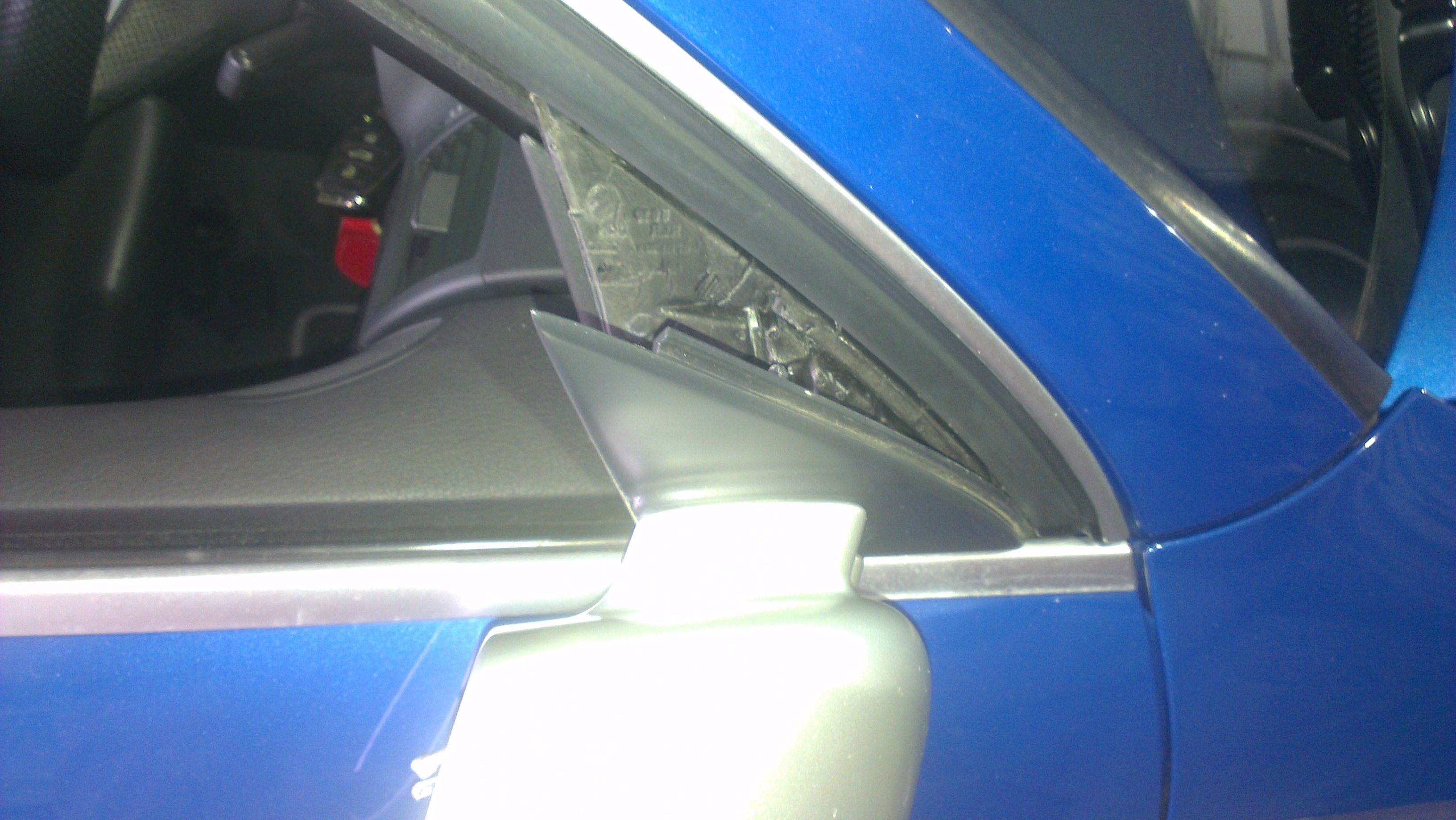 i use a trim tool for this but again you can use your fingers, this just unclips. now undo the large silver torx. from the outside pull your door mirror down and out, this will be tight as the black mounting plate is tucked behind your rubbers. once the mirror is removed(but still attached at this point by the wires), remove the two small torx from behind the black triangle mounting plate. now re-attach the mirror to the door with the large silver torx, dont worry about tucking the top part behind the rubber just tuck the bottom in and nip up the torx just enough to hold the mirror.