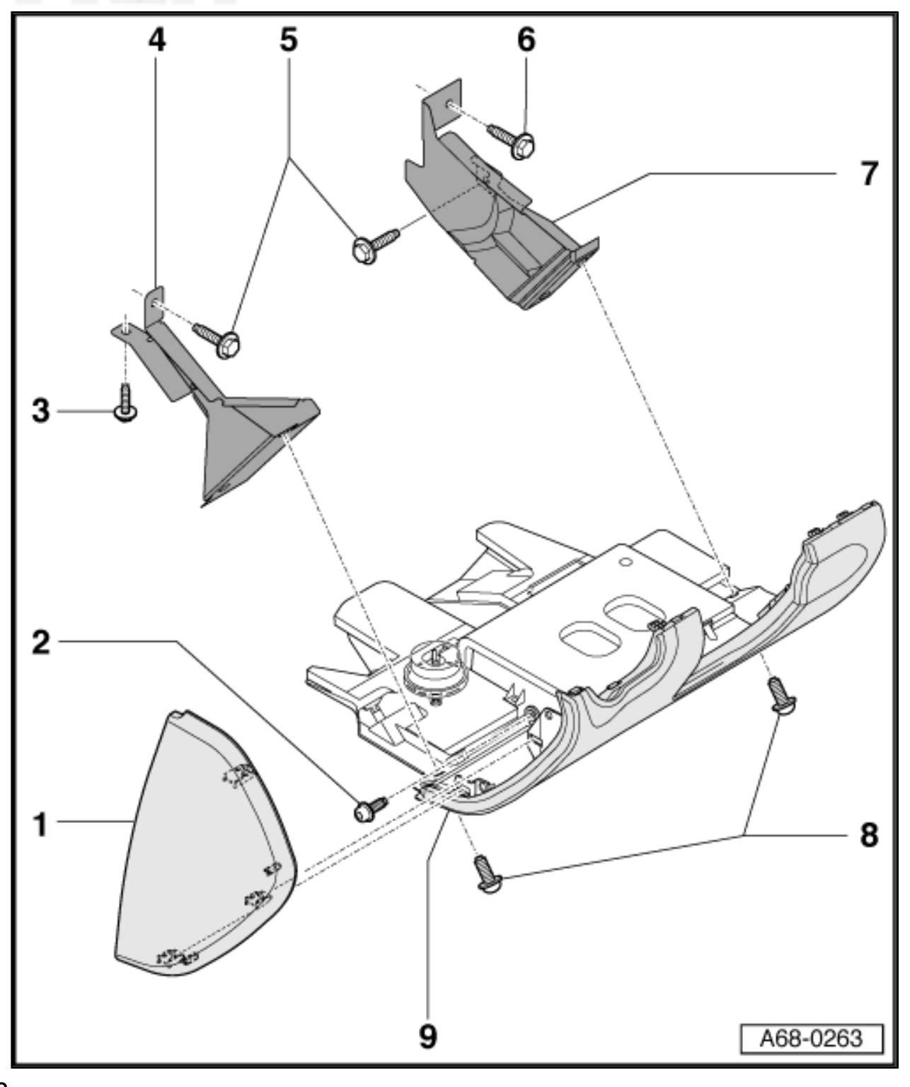 You have to remove the instrument panel cover (1), and screws (2) and (8) to get the compartment (9) off of the dash. You do NOT need to remove the supports (4) and (7). Now you’ll see the BCM down to the left of the steering column: