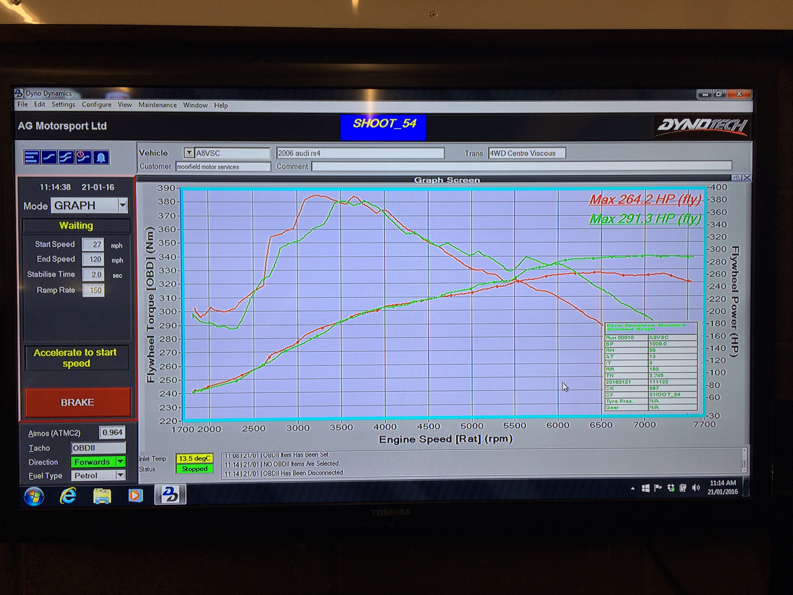 To say I got a shock was an understatement. After the first 4 consistent runs it returned a result of 264.2 HP at the fly wheel. Holy