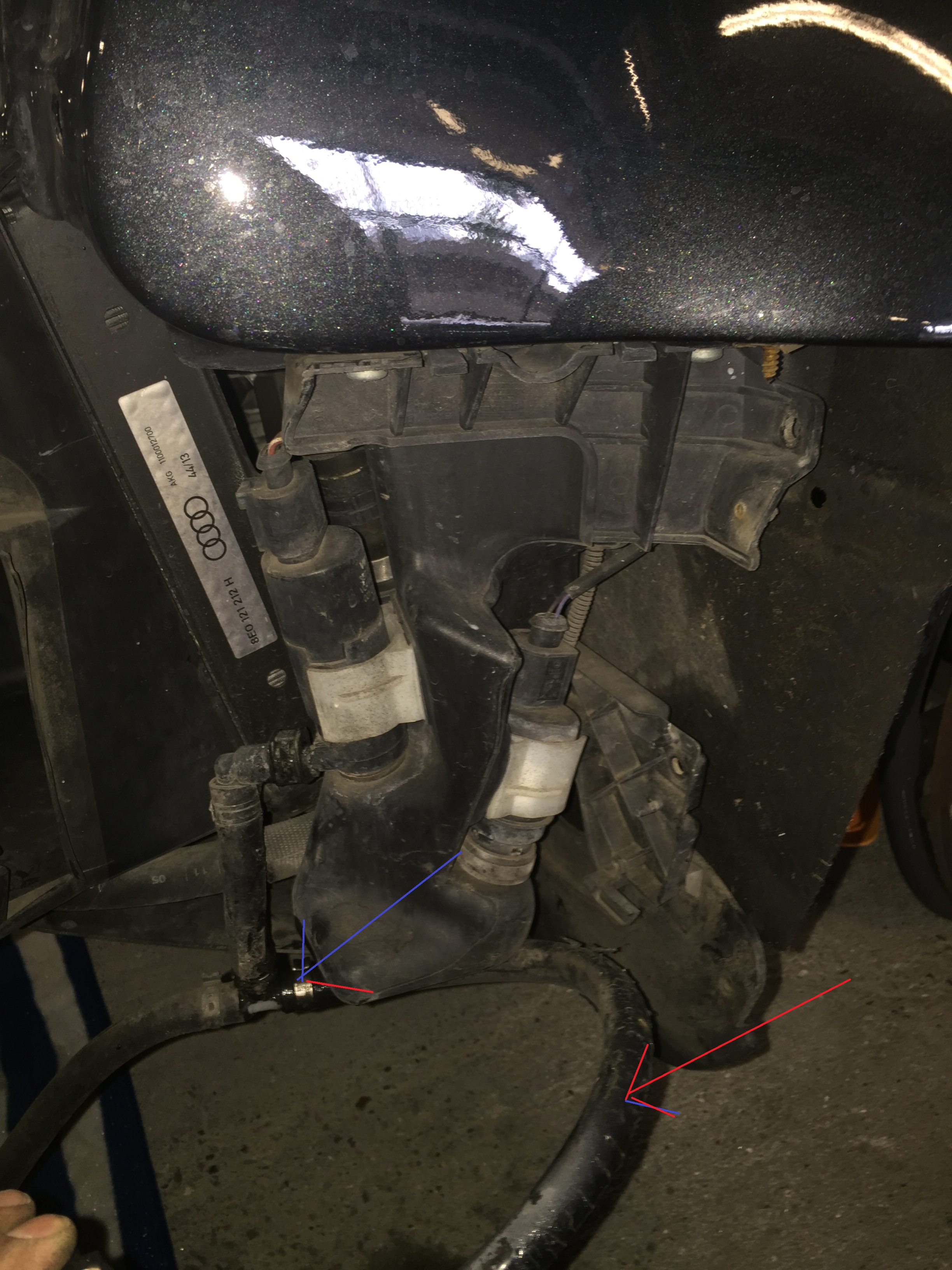 Red is the cracked hose and blue the source of the leak.