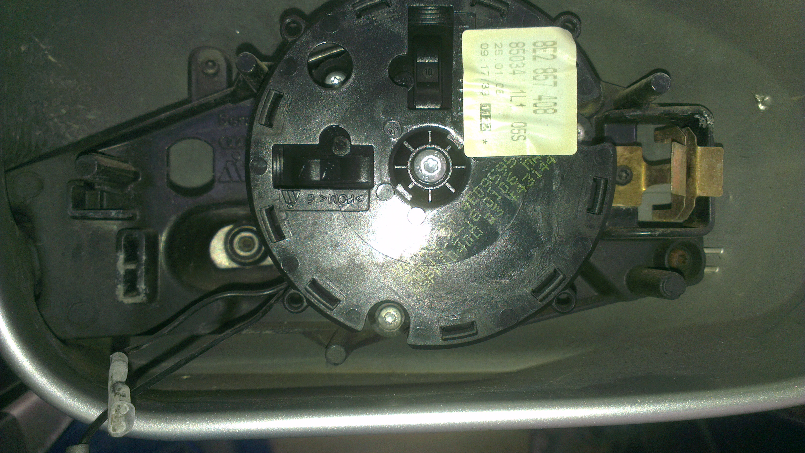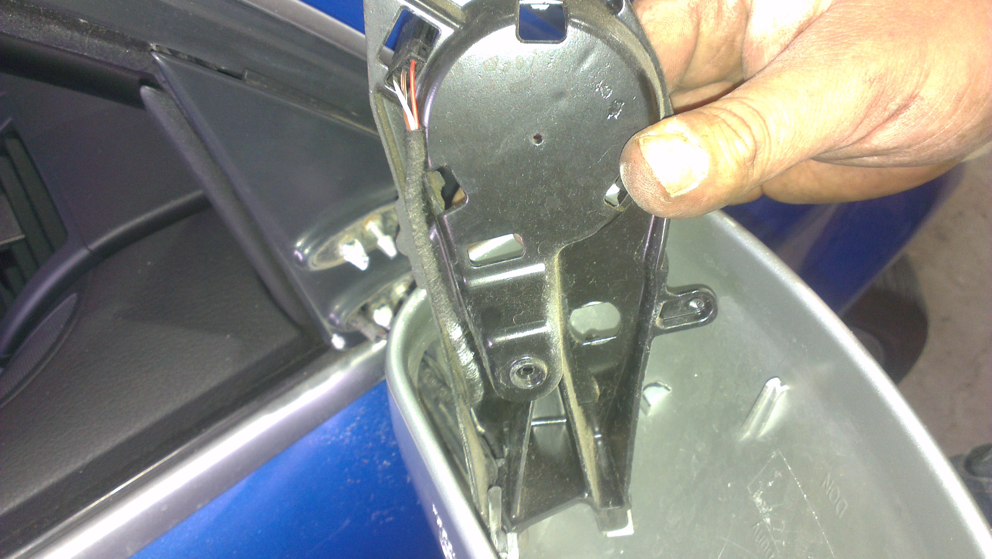 with the mirror temporarily re attached, now undo the torx holding the metal motor mount plate in. now time to separate mirror casing from the mount.