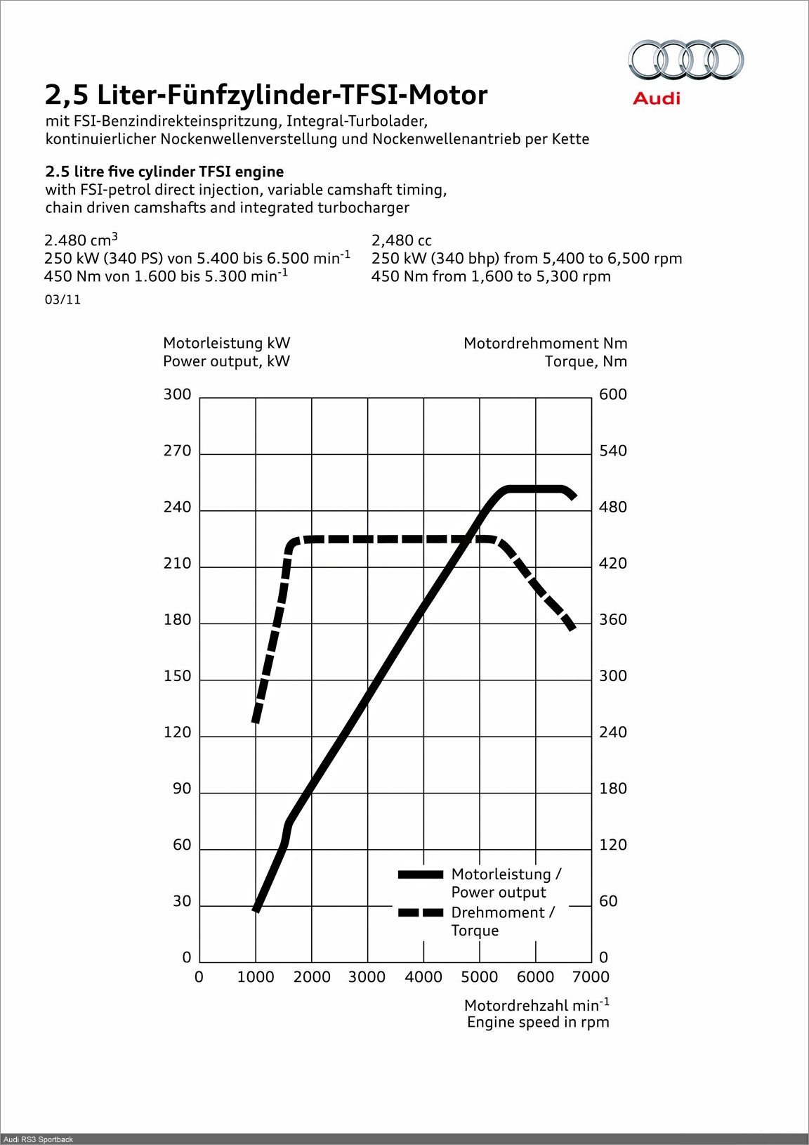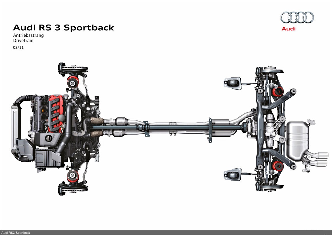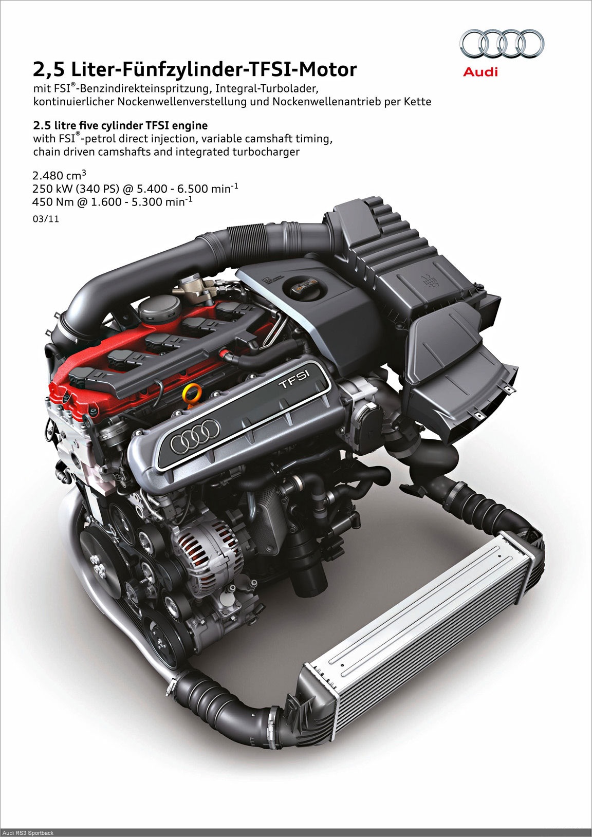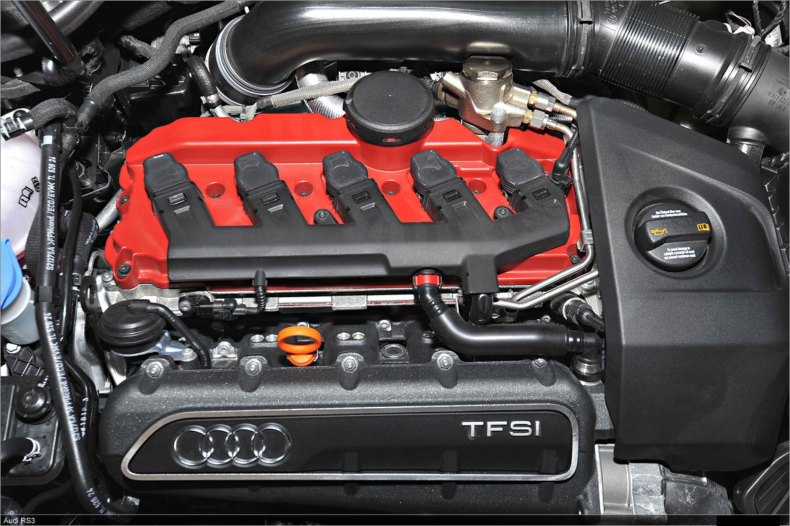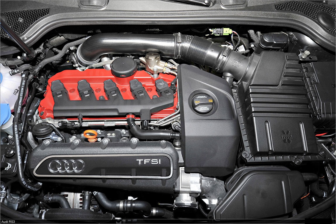 Named “Engine of the Year” in 2010, the 2.5 TFSI delivers 250 kW (340 hp) from a displacement of 2,480 cc. Its specific output is 100.8 kW (137.1 hp) per liter. The peak torque of 450 Nm (331.90 lb-ft) is continuously available over a broad rev range between 1,600 and 5,300 rpm.