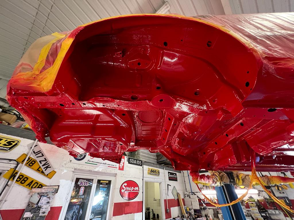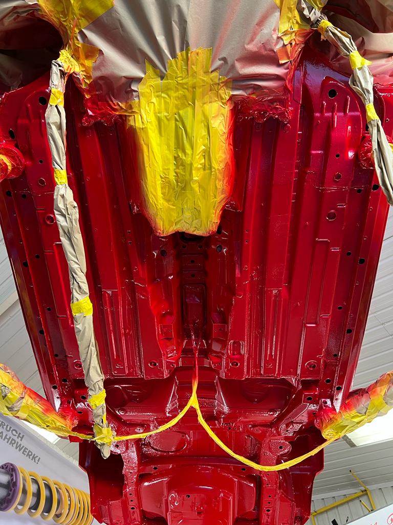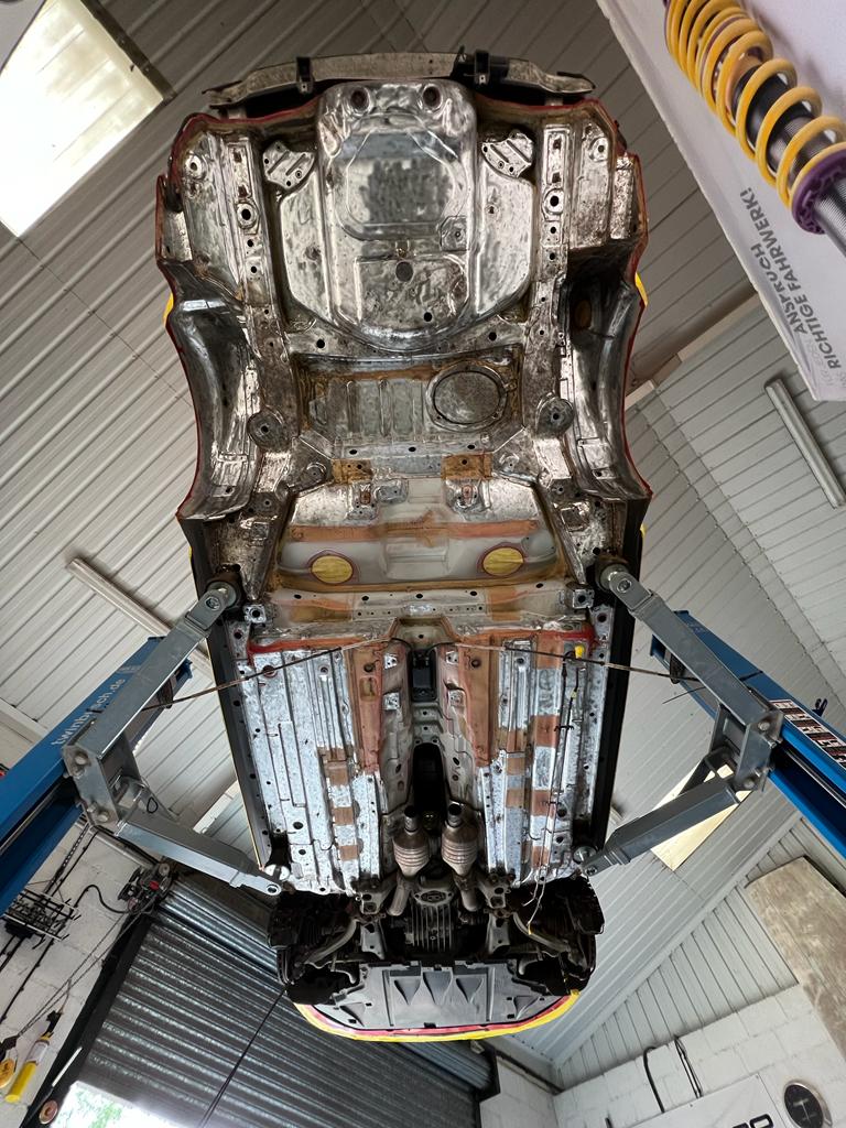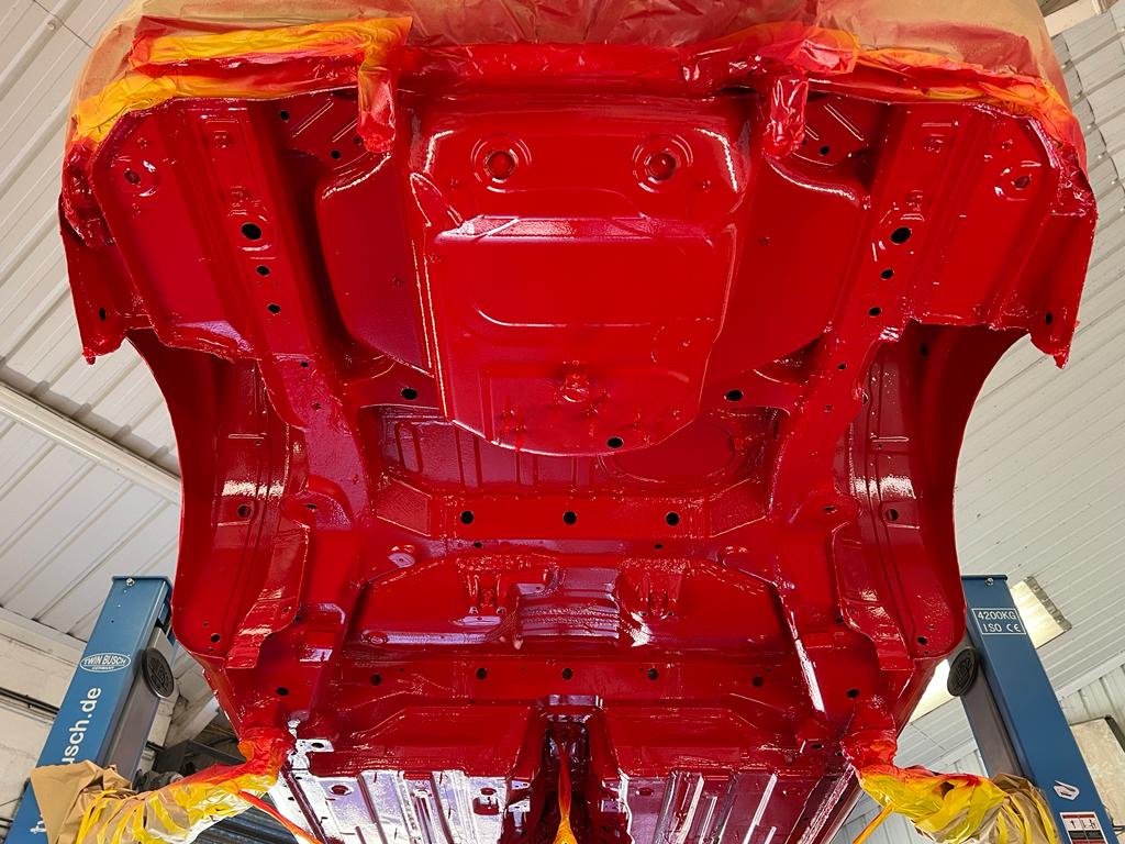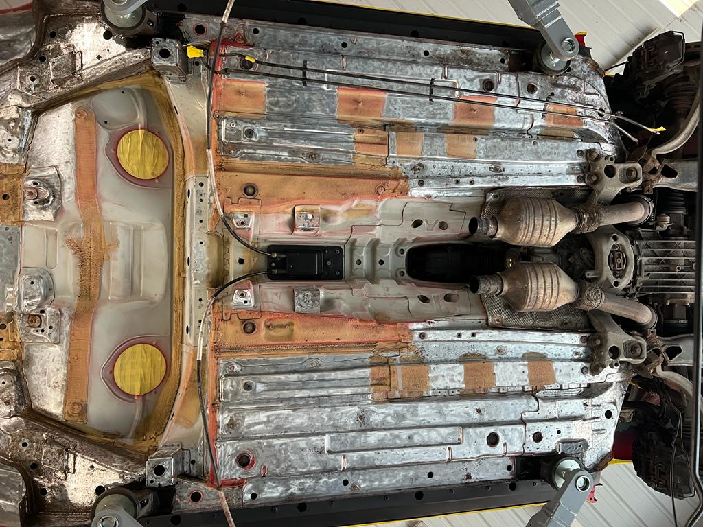 With all the corrosion removed, the bare underside was then treated with mastic epoxy followed by body colour and then finished with clear coat.