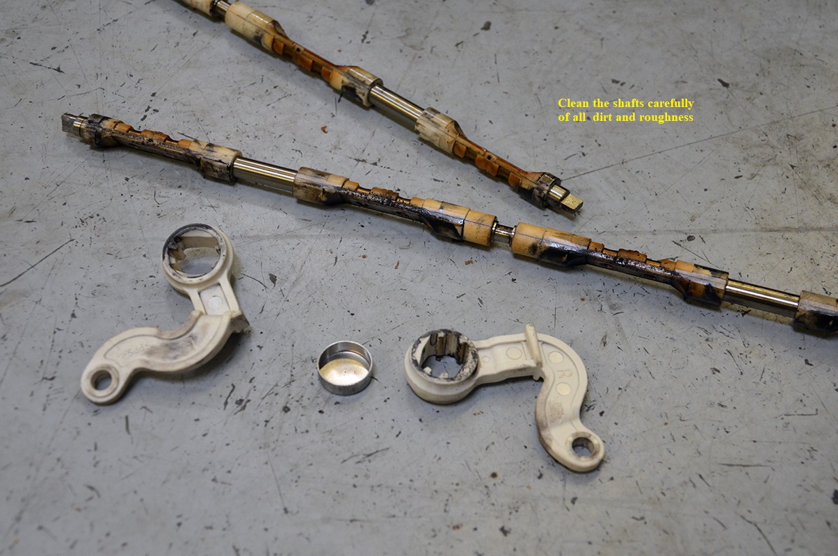 These shafts need to be carefully cleaned and all the crud removed from them. I used a scotch pad on some places and brake cleaner. Remove any roughness from the Nylon sections too.