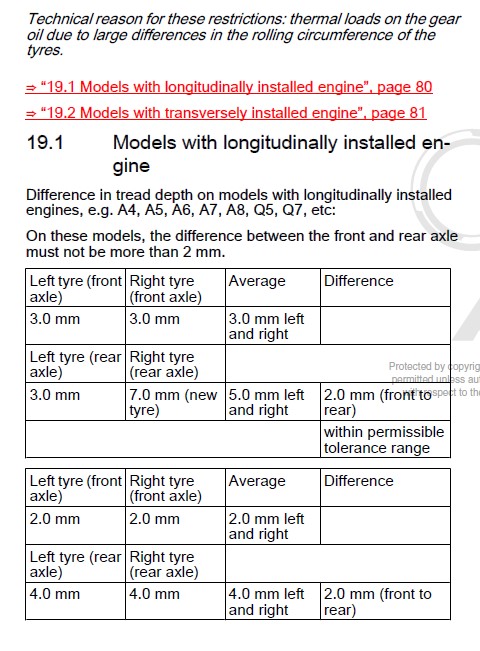 Also don't forget that the tyre tread depths have to be within limits as well or the torsional differences will cook your diff / gearbox oil apparently.