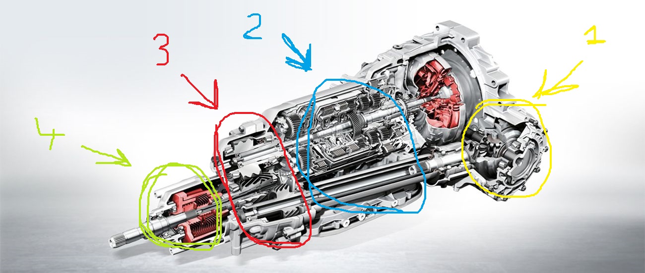 On previous ZF gearboxes the two diffs (1 and 4 in your image) use a single diff oil reservoir whilst the gearbox core (items 2 & 3) again uses its own centre reservoir.