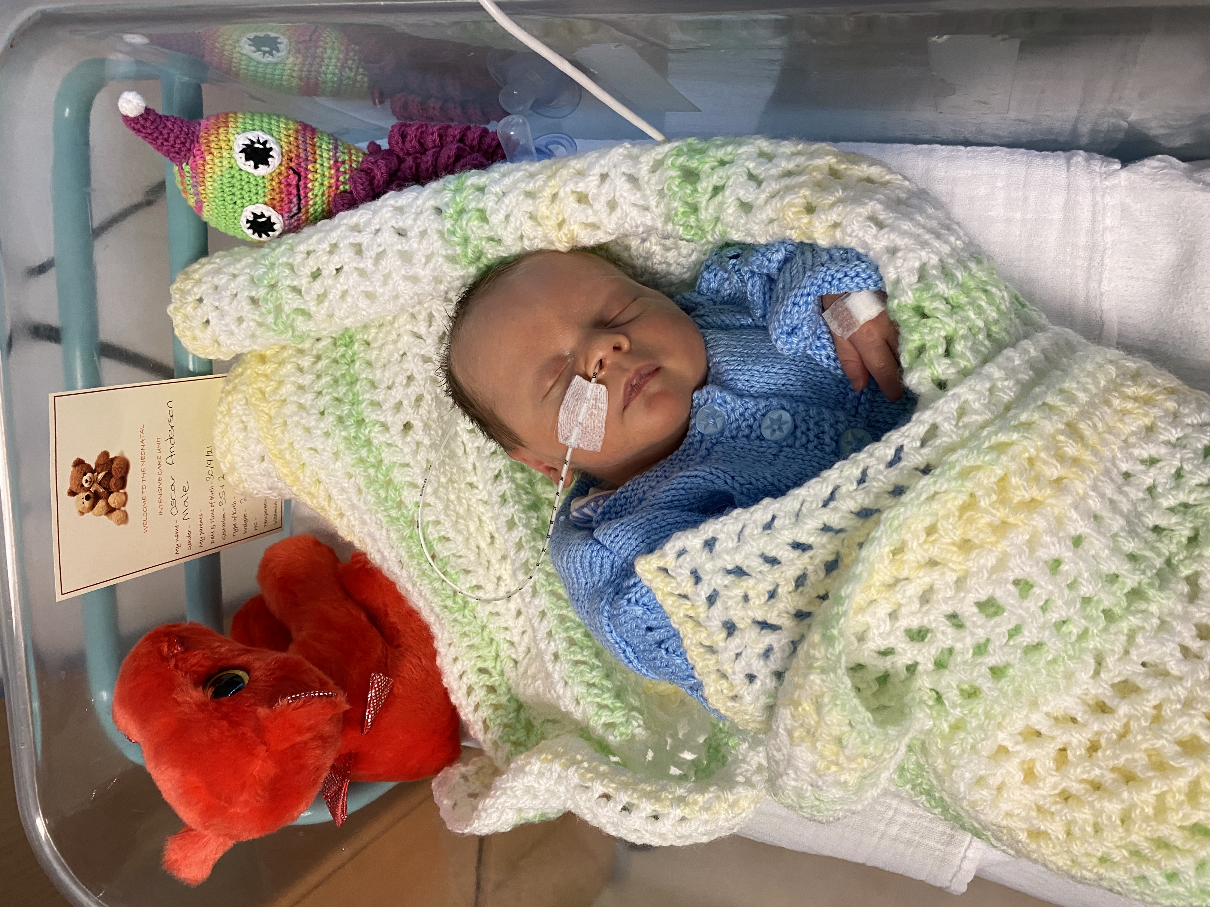 Oscar Charlie Anderson was born at 1158 on Thursday 30th September, coming out at 5lbs 9oz and delivered by C section. He was born on an elected C as he’s been a bit poorly throughout the birth, requiring a number of intrauterine transfusion.