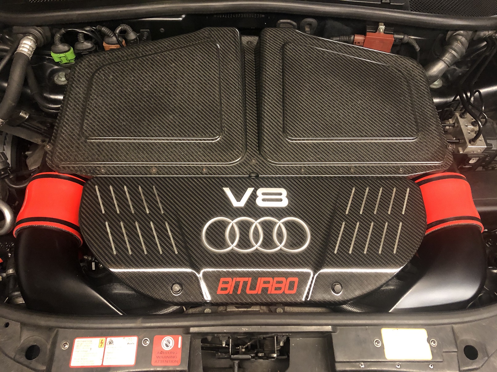 It’s stock inlets, sprayed in satin black along with Roose motorsport hoses in cherry red (good match to the RS6 colour), topped off with black mikalor hose clips.