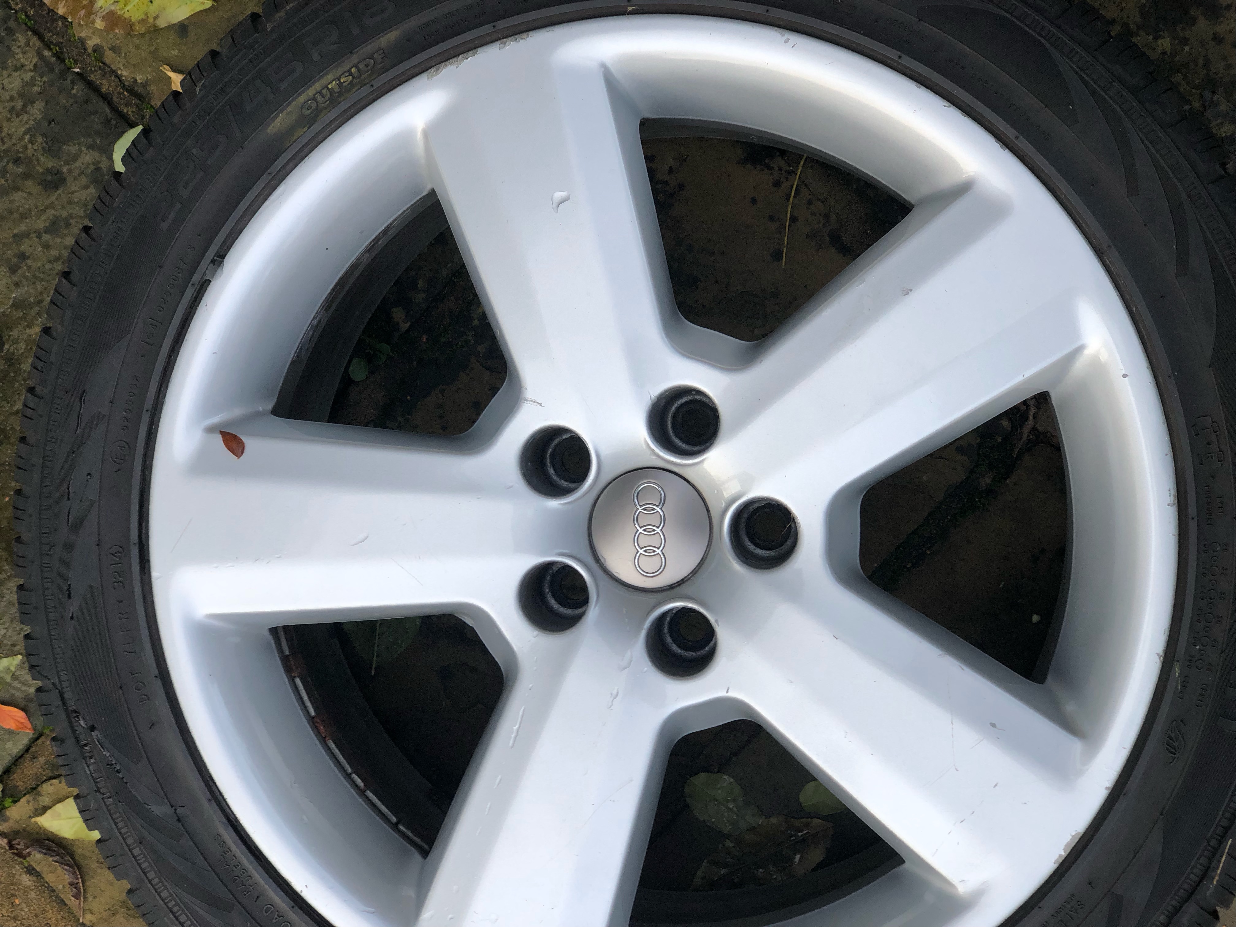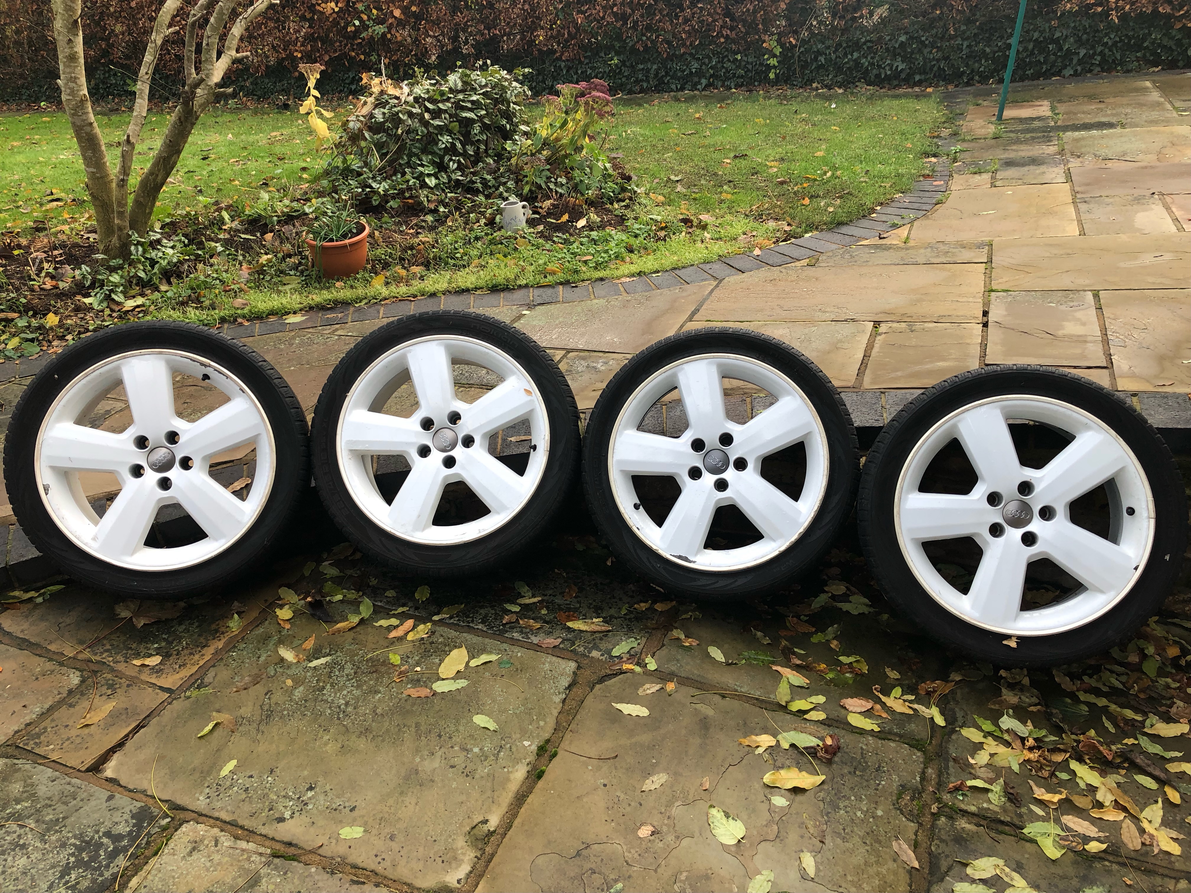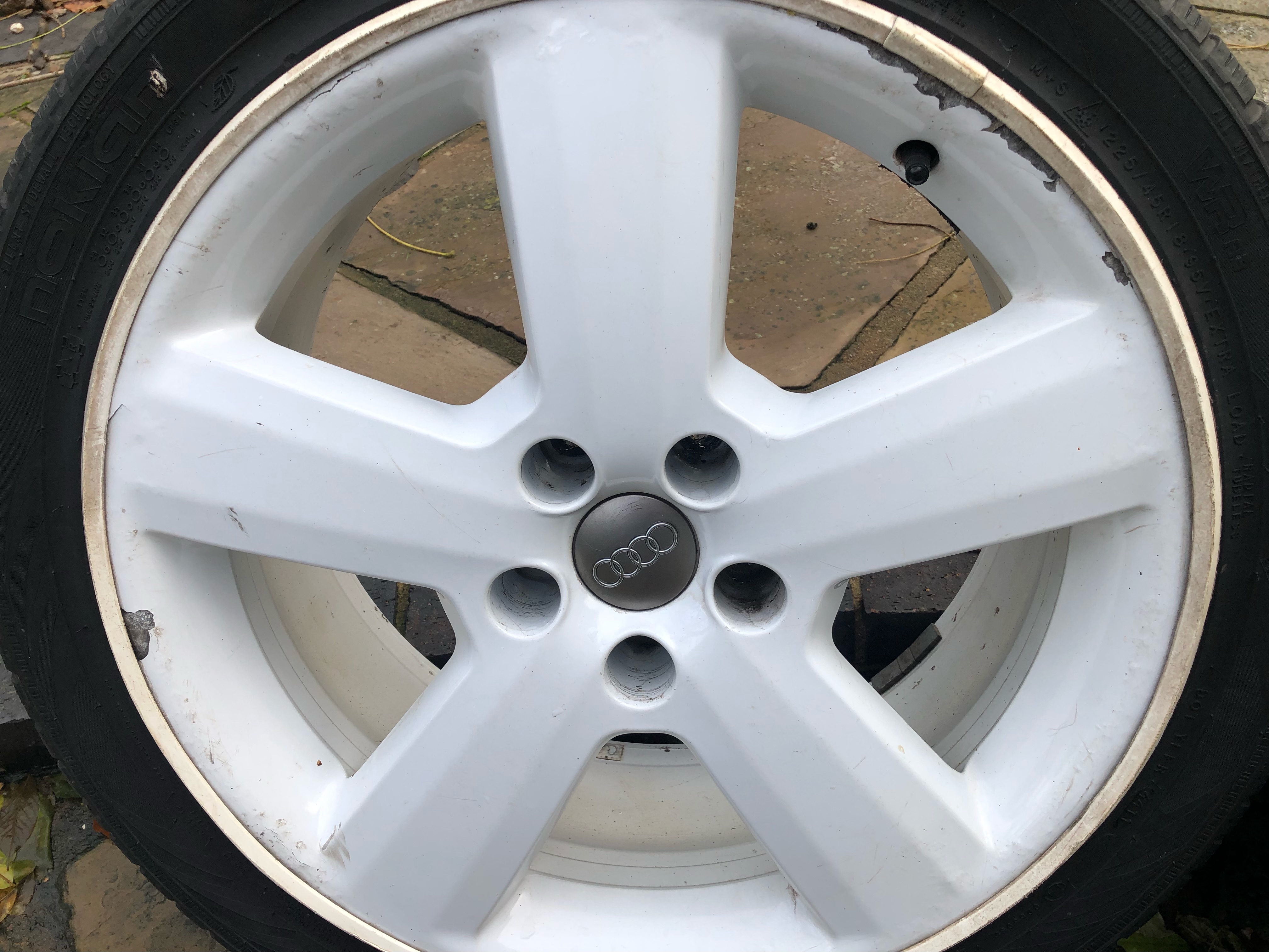 4 x white ones 1x bright silver, all undamaged but could do with refurb colour to suit. All with 225/24/18 Nokian WR A3 Winter tyres 3x5mm 1x7mm