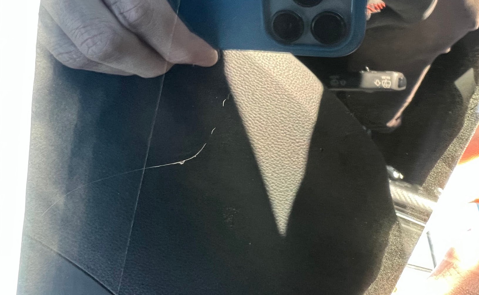 On getting home, I investigate discover that it's actually a massive gash that's been scratched on the inside of the windscreen, presumably in a layer of polarising film or something as part of the HUD. Someone must have had something sharp and rigid like a screwdriver in their hand while holding the steering wheel. I'm not even sure a set of keys could do this unless you were really going for it.