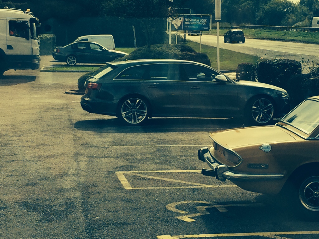 Something you don't see everyday C6 RS6 on A1 south with junction to M62 OU 08 *** I think. Was nice. Now sat at Peterborough Alwalton services on A1 South and looking at a brand new C7 Daytona grey AF 14 *** tried to take a sly picture as owner is in same restaurant.