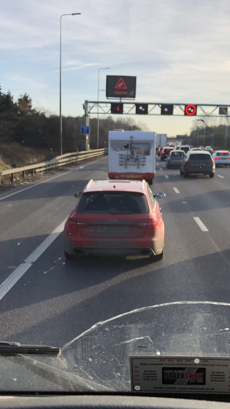 I was the one following real close and your missus was looking in her mirror probably think there’s an arsehole behind. I came off at junction 5 Solihull when the traffic was really slow. White/dirty 18ton Mercedes Seafood truck