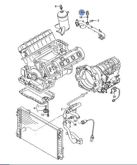 Right, that was a bastard job. The sender is almost completely hidden, so it you don't know exactly where to look, you'll have real difficulty finding it. Anyway, job done, with slightly more than the usual amount of skin lost. Here's a pic to help others locate the sender. In this picture, the electrical connector is off, and you can see the green sender. As you can see, the sendor is almost horizontal, as opposed to the exploded diagram above. I put a little cross on the sendor so I didn't confuse it with the new one.