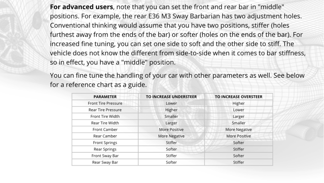 Think I'll try rear first and see if that balances the understeer or just makes the car unstable, before trying front