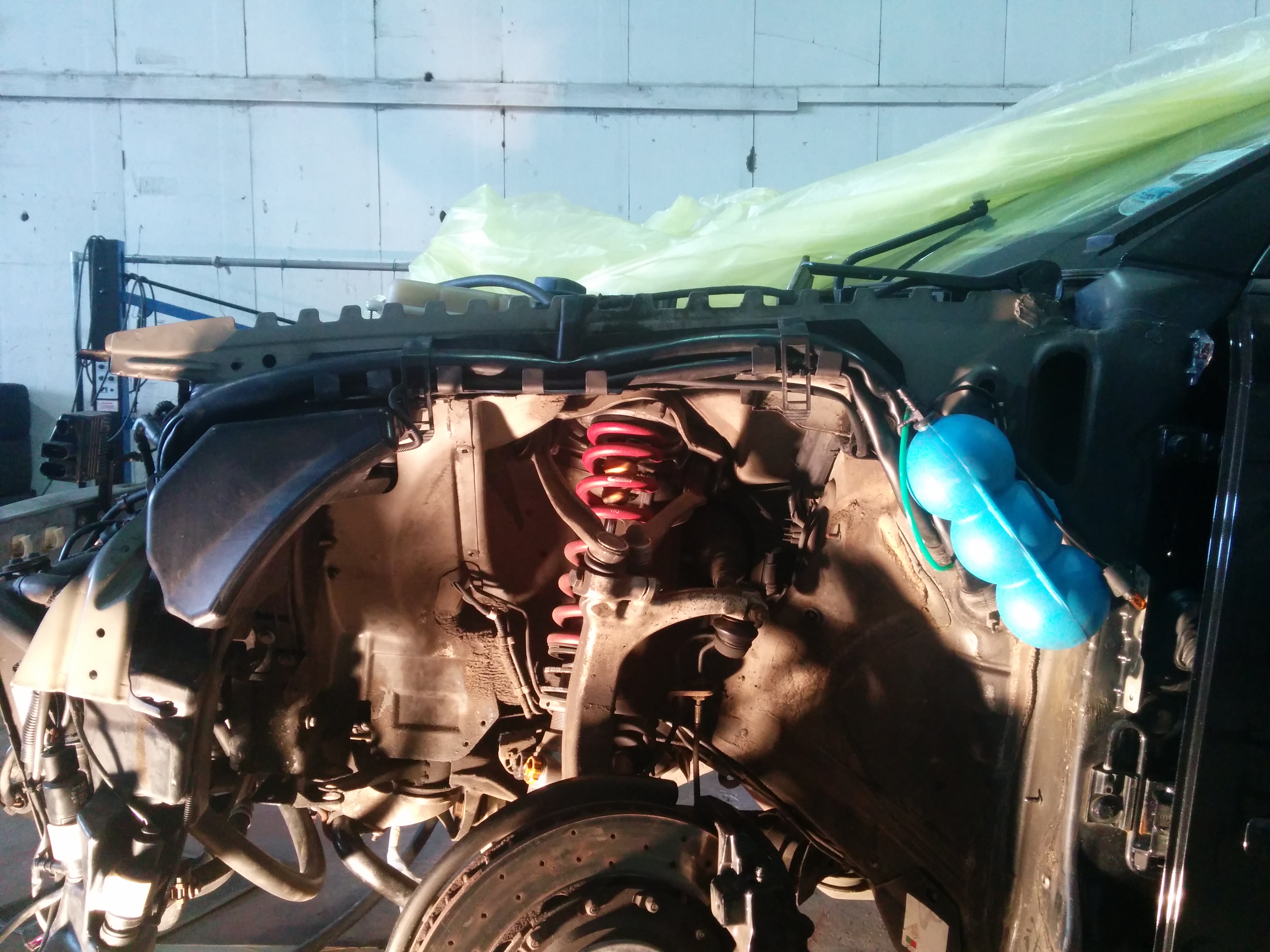 just enough room to get the wheel arch liner back in, looks like i need to raise my suspension up a touch or roll the wing edge as the marks are where the tyre have been rubbing on compression. pipes tucked away nice with the the dryer hung it was time to make the last adjust to the long blue line, we new from the outset that this pipe would probably need shortening depending on the final route. jhm recommended running the long line along behind the bumper reinforcement bar back to the other side of the car, so i hung the bumper without the front panel on so we could check the length.