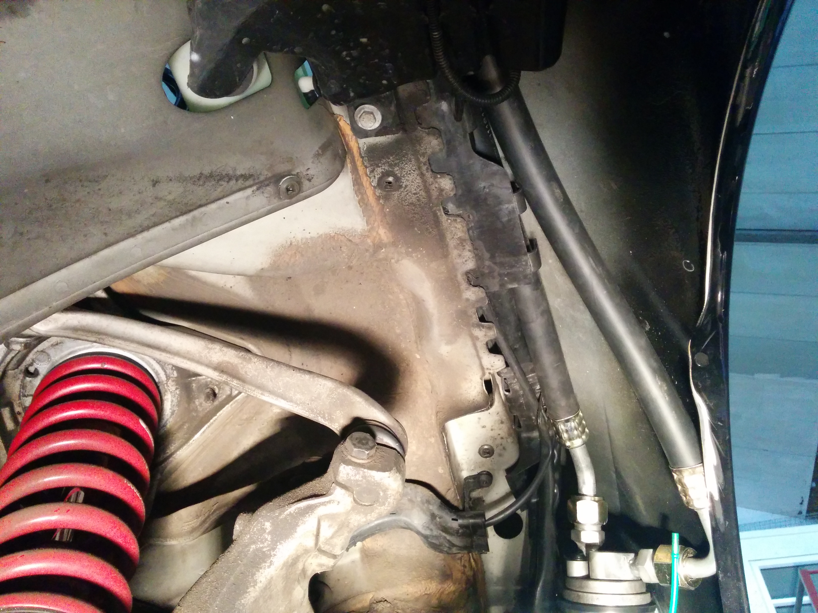 i removed my wing to get the length and route of the ac lines right, for future kits this should be all doable with the wing on. jhm say to relocate the front reservoir to down behind the front o/s aux rad. i have decided not bother refitting the front reservoir as i dont believe my car needs it.