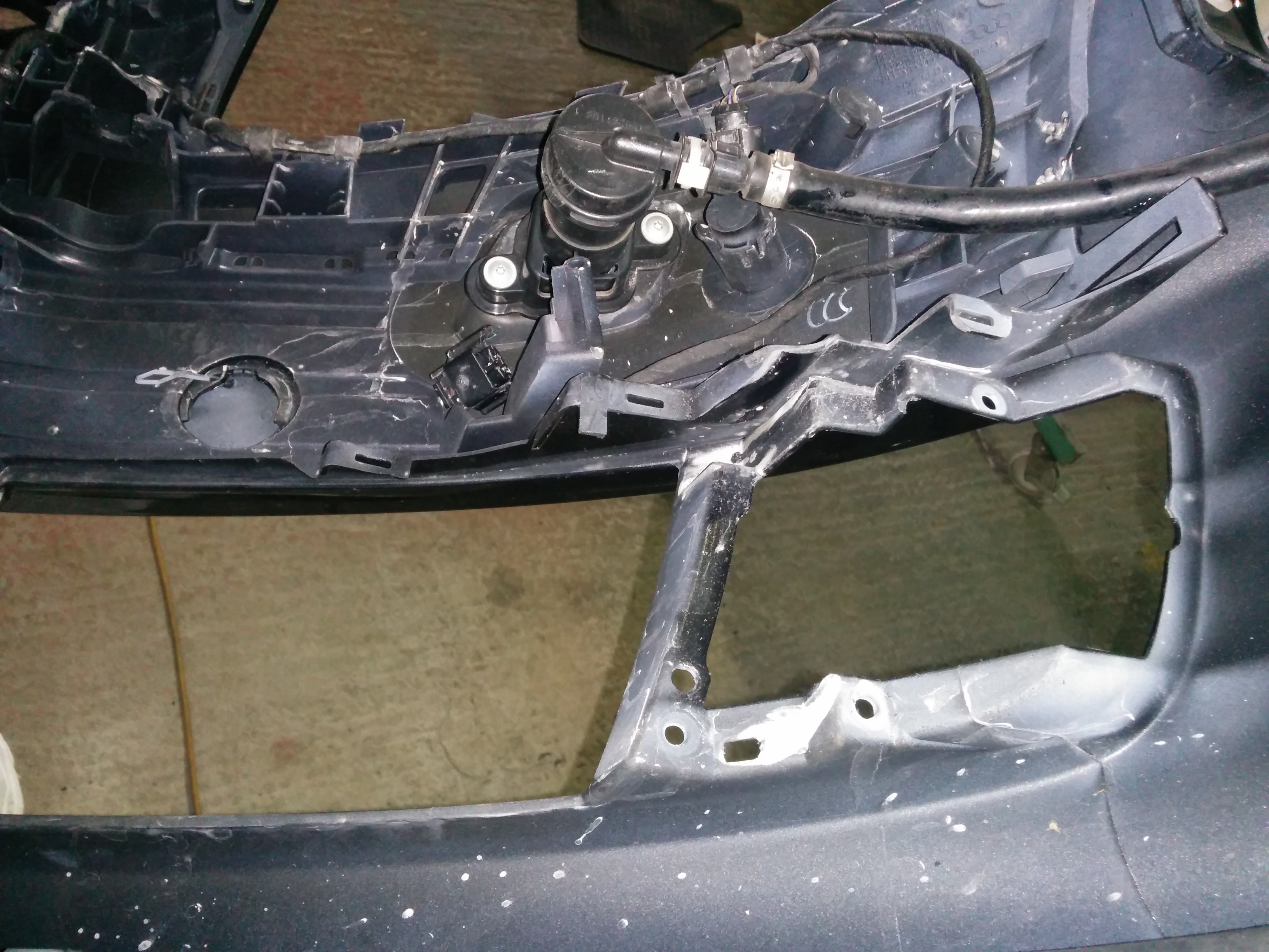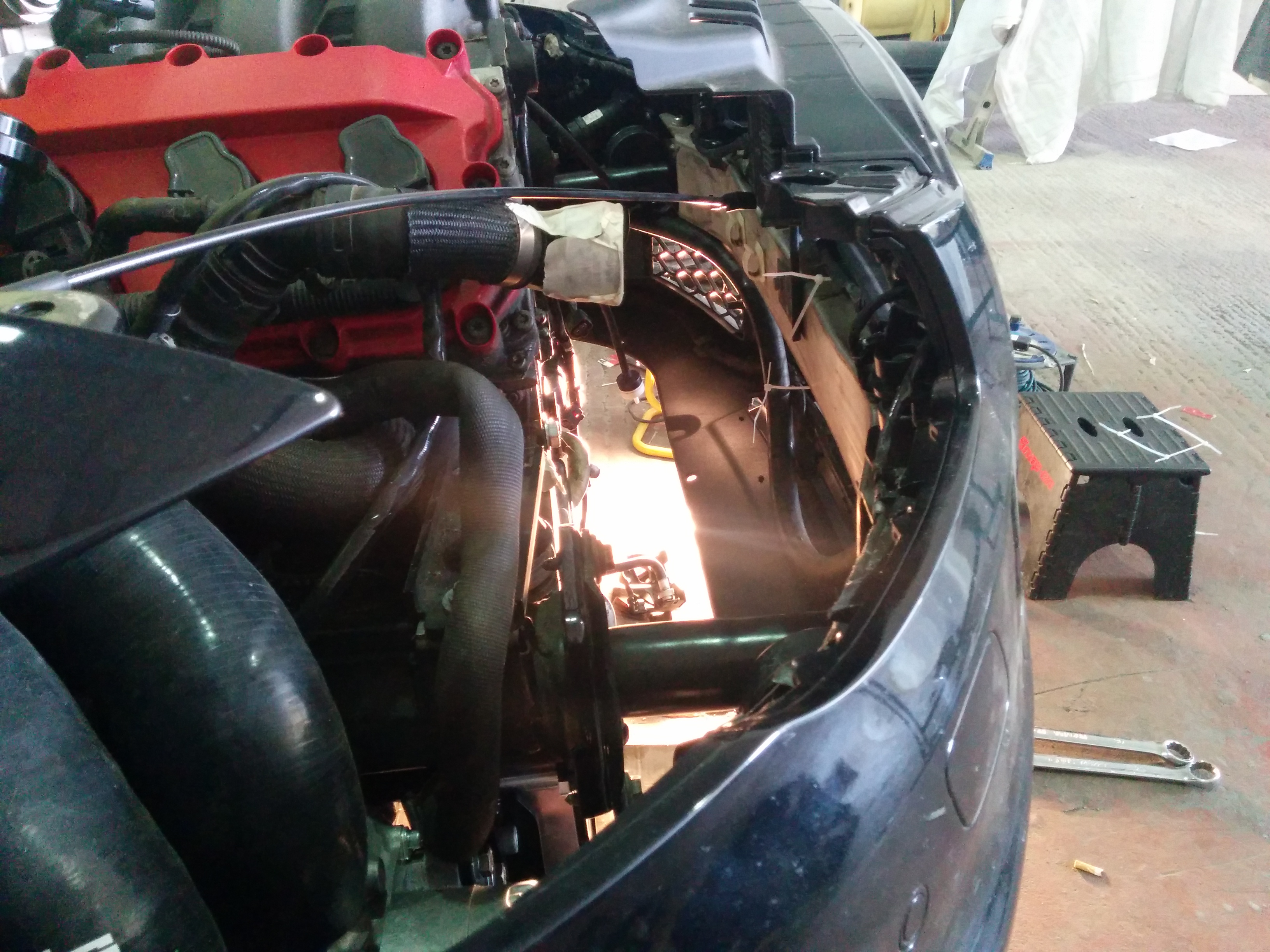 with the bumper on you can see how close the supercharger would be to the foglight. with the bumper back off i removed the bracket that holds the foglight in for more clearance, i also shaved off a couple of centimeters of plastic from the back of the bumper just to be sure. back on the car to triple check for clearance, all good.