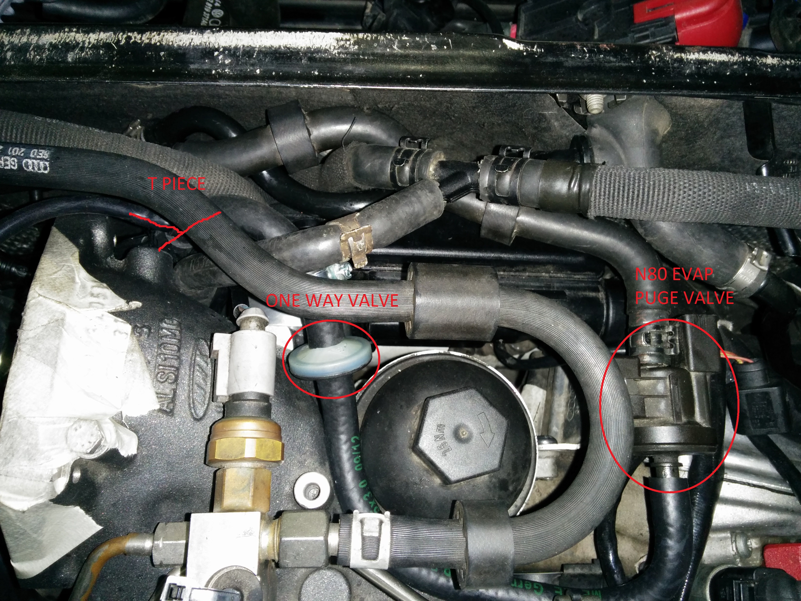 the fuel evap circuit consists of a vacuum line from the inlet manifold behind the throttle body to the N80 purge valve from there a pipe runs round the back of the engine and through the inner wing to a charcoal filter which is then connected to your petrol tank, the idea being excess fuel vapor is sucked from the tank when the ecu tells the N80 valve to open via the vacuum provided from the intake manifold.