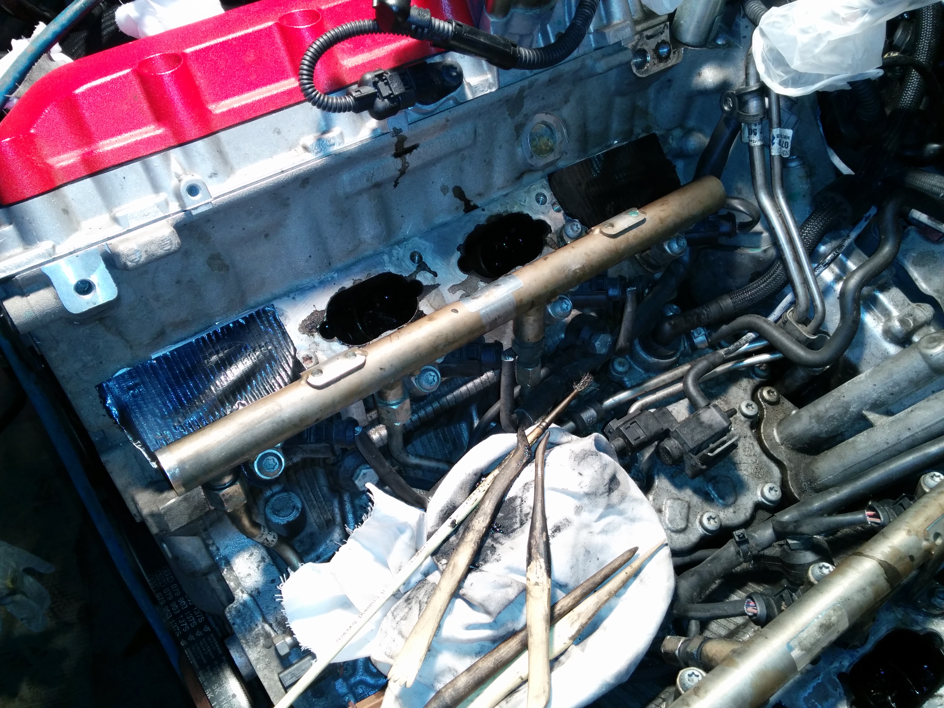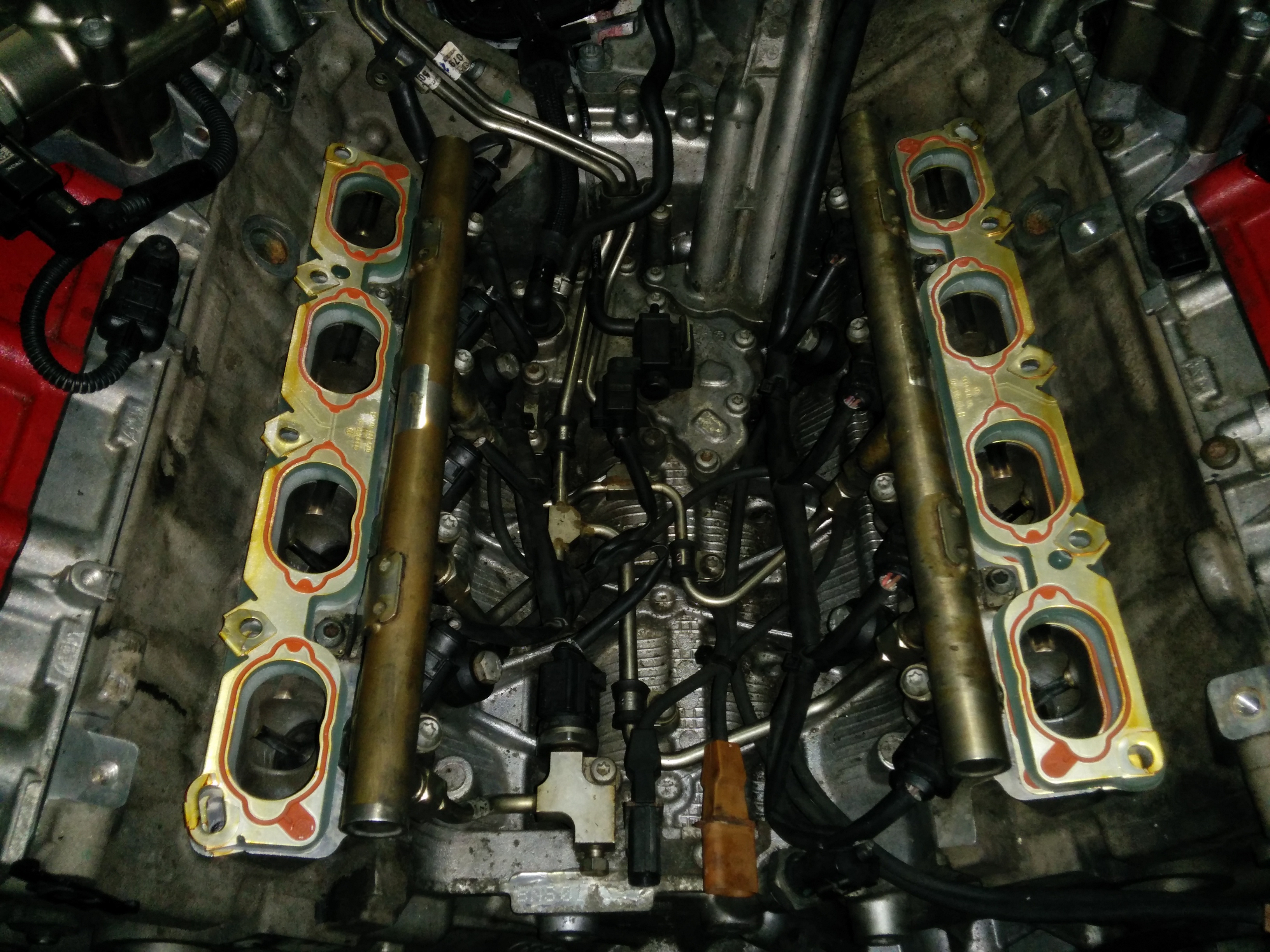 fuel lines tweaked and manifold back off, spacers can go in. manifold back on, new plugs fitted and coil packs back on.