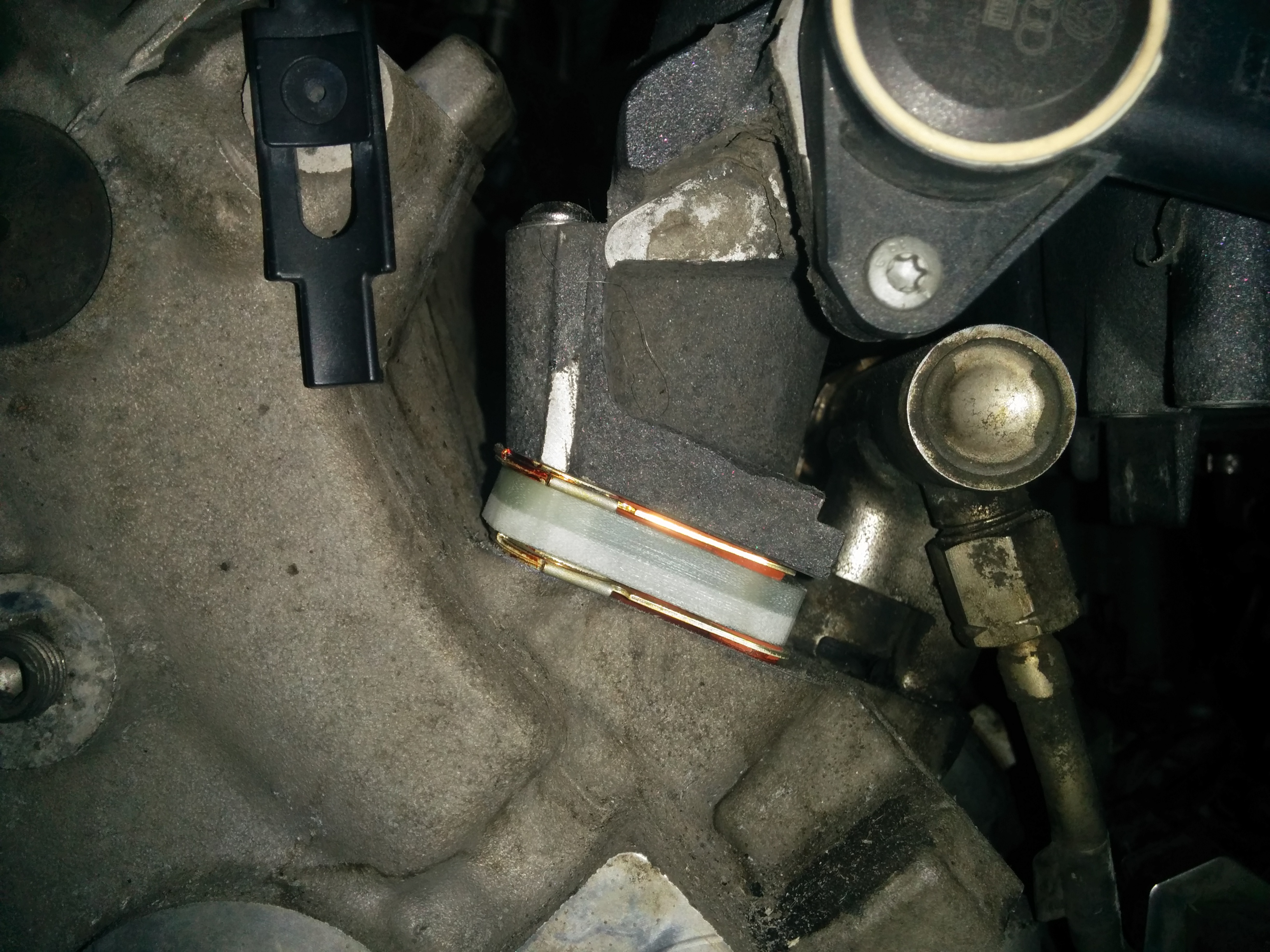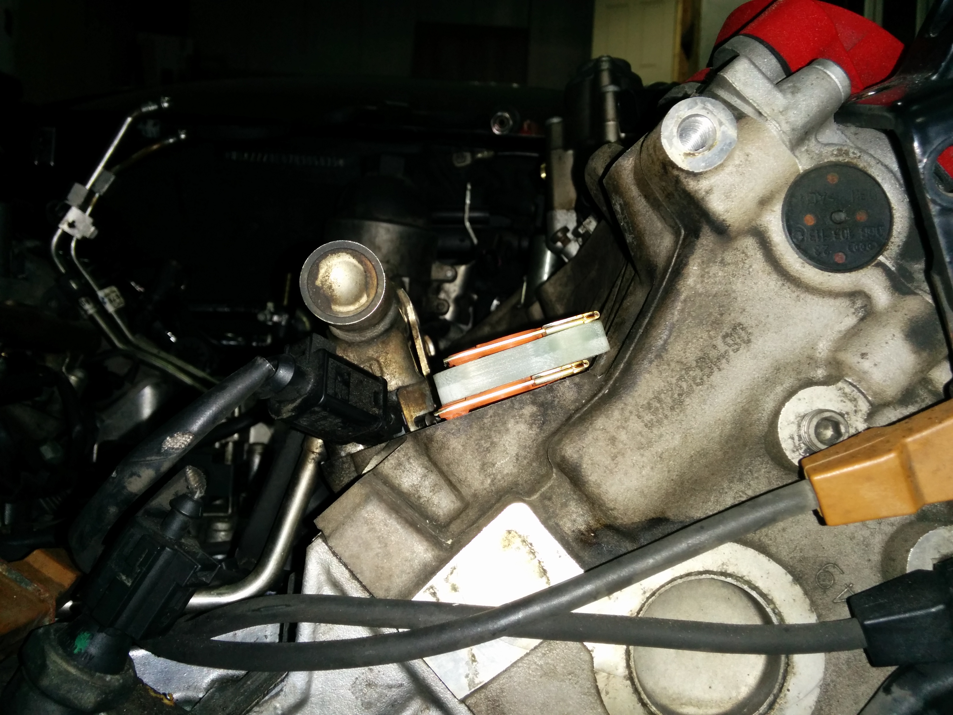 here is the oil separator with the new check valve that needs installing. in hindsight i should have installed this on the manifold while it was out, the aluminium piece that houses the valve needs bolting onto the manifold first then the oil separator bolts to that. there is very little room to work behind the manifold when its on and when trying to slide the separator into the the aluminium piece we managed to damage the o ring, audi dont sell the o ring separate so i have measured it up and ordered some online.