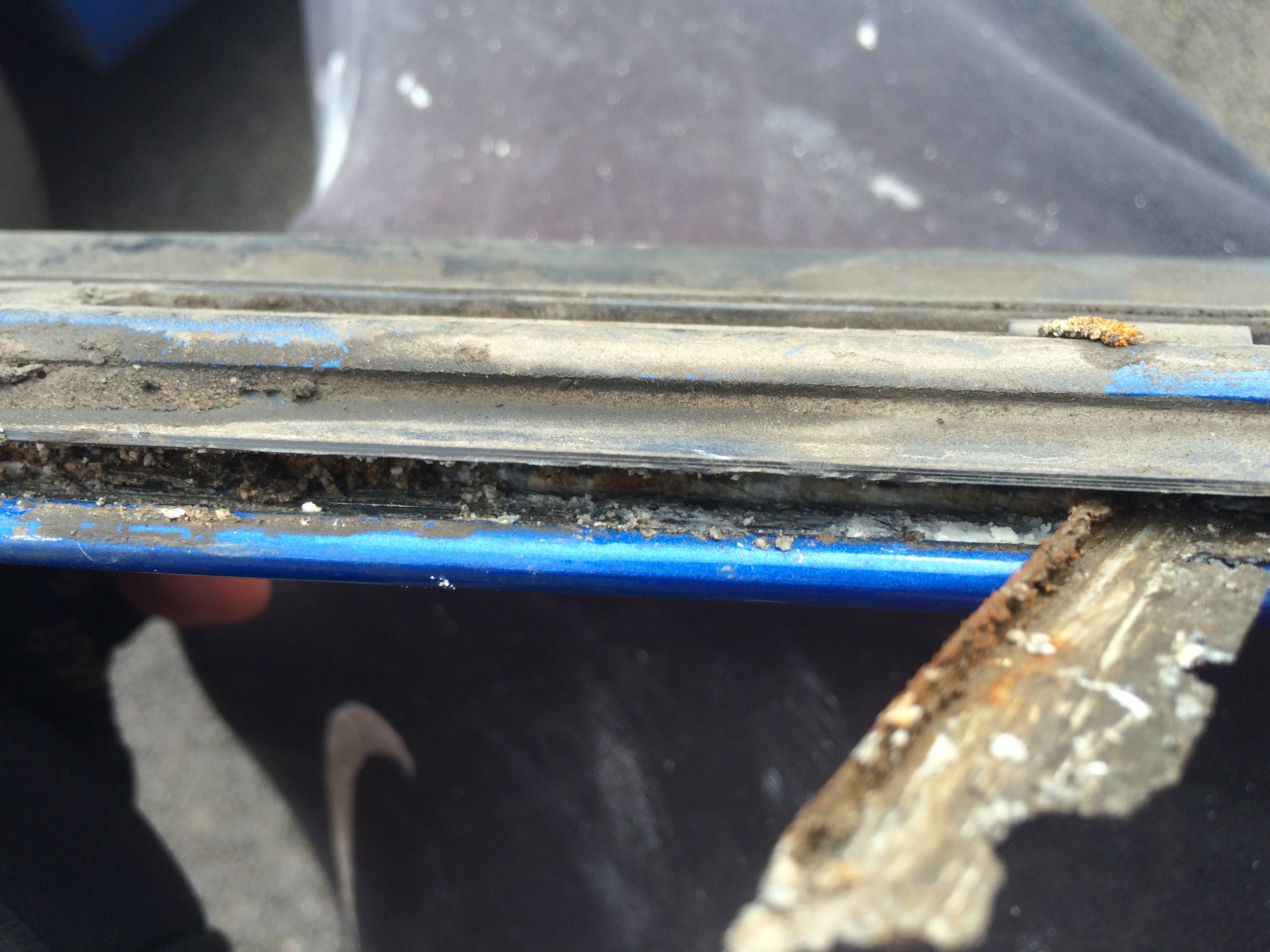Noticed the exterior strip of trim at the very bottom of driver and front passenger door is bulging ever so slightly at one end. I removed the trim to have a look, just seem that the plastic fascia has bulged away from the backing is filled with all kinds of dirt, not sure what's caused it. The fascia and the back are glued together it seems so not sure how to split them without causing damage.