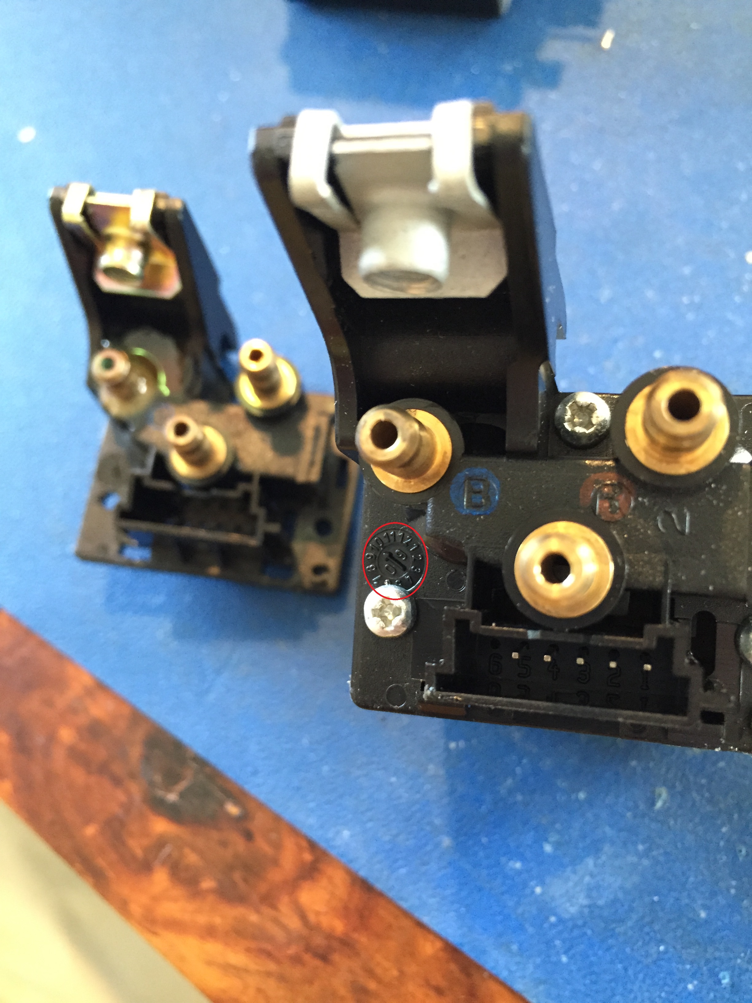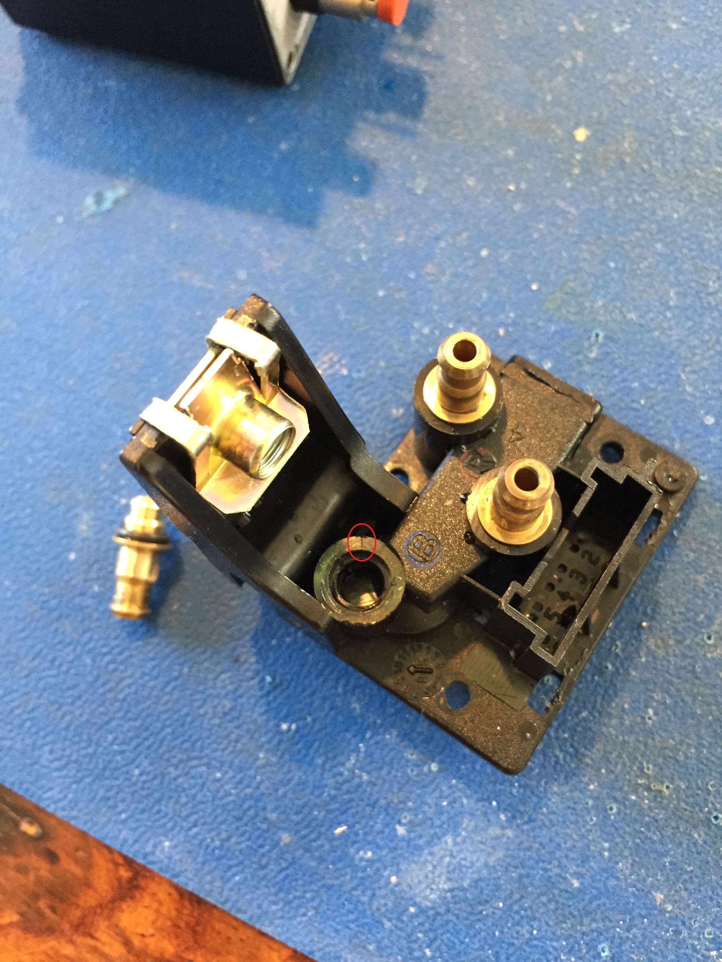 So i am purchasing new item 8's. Next, release the leather. It pulls out of the retaining grooved in the backrest as shown. Releasing the leather all the way around the backrest, the seat cover can pivot forward. (I left the leather attached at the base). The lumbar pad is removed in this image, exposing the valves. The left valve (Item 7) controls the side bolsters. The right valve (also item 7) controls the Lumbar. To remove the valve, disconnect the connector and carefully pull the hoses off, noting their locations for re-fitting! After hours of investigation and leak tracing, i found this crack. (Circled red). (Don't remove the brass insert, it is not necessary.)
