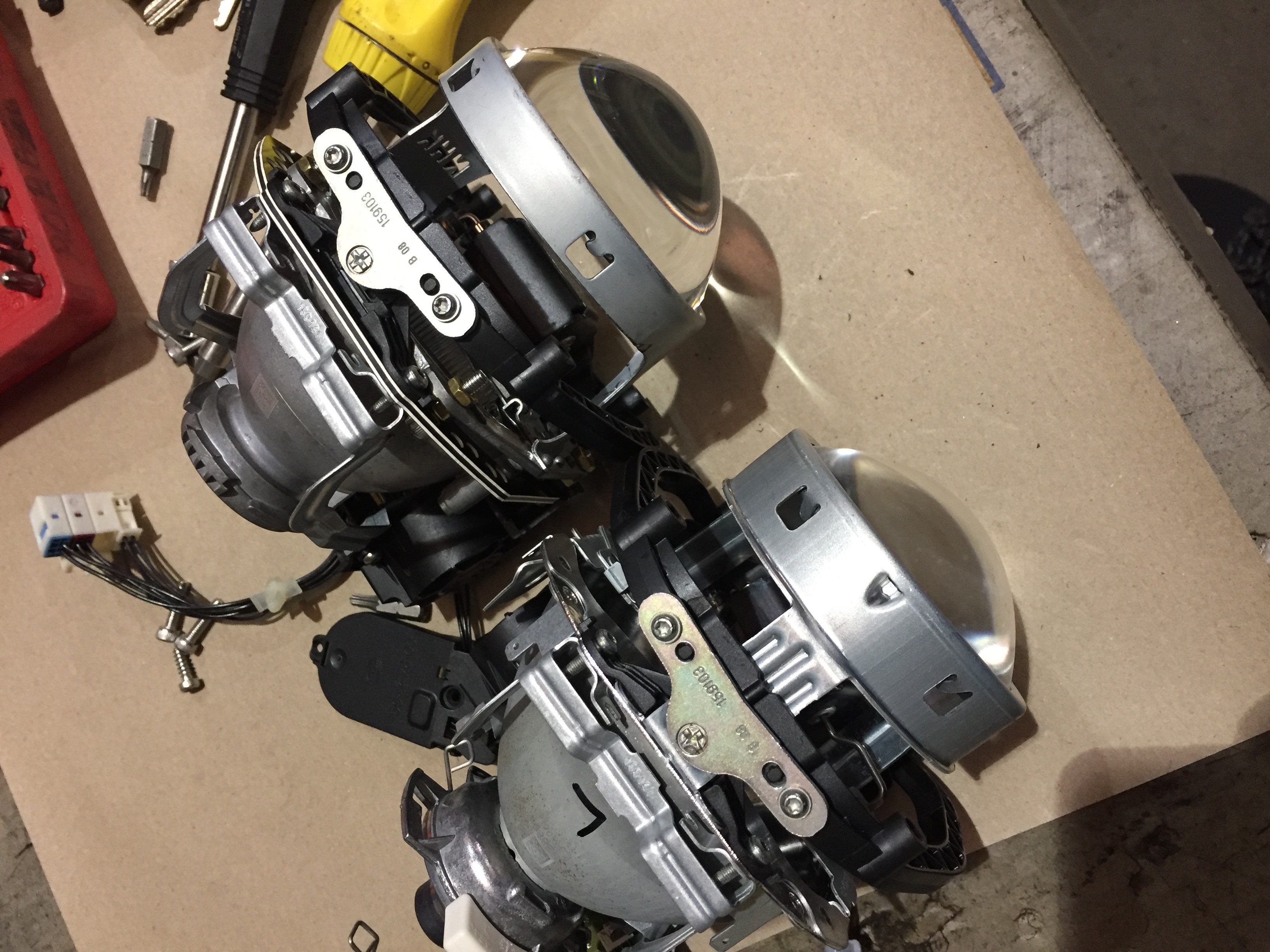 Received an email of Trups saying that the conversion on the headlights was complete and he was heading to MRC to help install and set them up. MRC had already completed all the work needed (engine out for oil leak, replace all gaskets and seals, change spark plugs, replace coolant lines, fit KW platforms and H&R anti-roll bars, replace suspension arms and drop links, gearbox service and remap, lower the car and four wheel alignment and stage 2 remap and pops and crackles added).