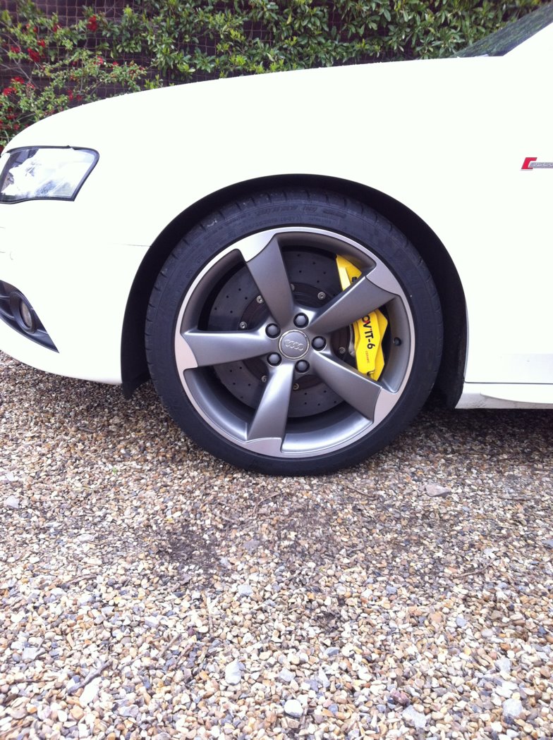 But, they fitted and now provide the car with the sort of braking reserved for Le Mans racers - they really are rather good. They came off my C5 RS6 and now of course have a lot less weight to haul down, so they should work jolly well too. They are considerably lighter than the OEM 345mm S4 discs - the huge 6-pot billet calipers are also lighted than the horrid single-pot cast iron unit fitted as standard. All in all a good (if expensive, if you didn't already have the Ceramics in a box in the garage....) conversion - both dynamically and visually.