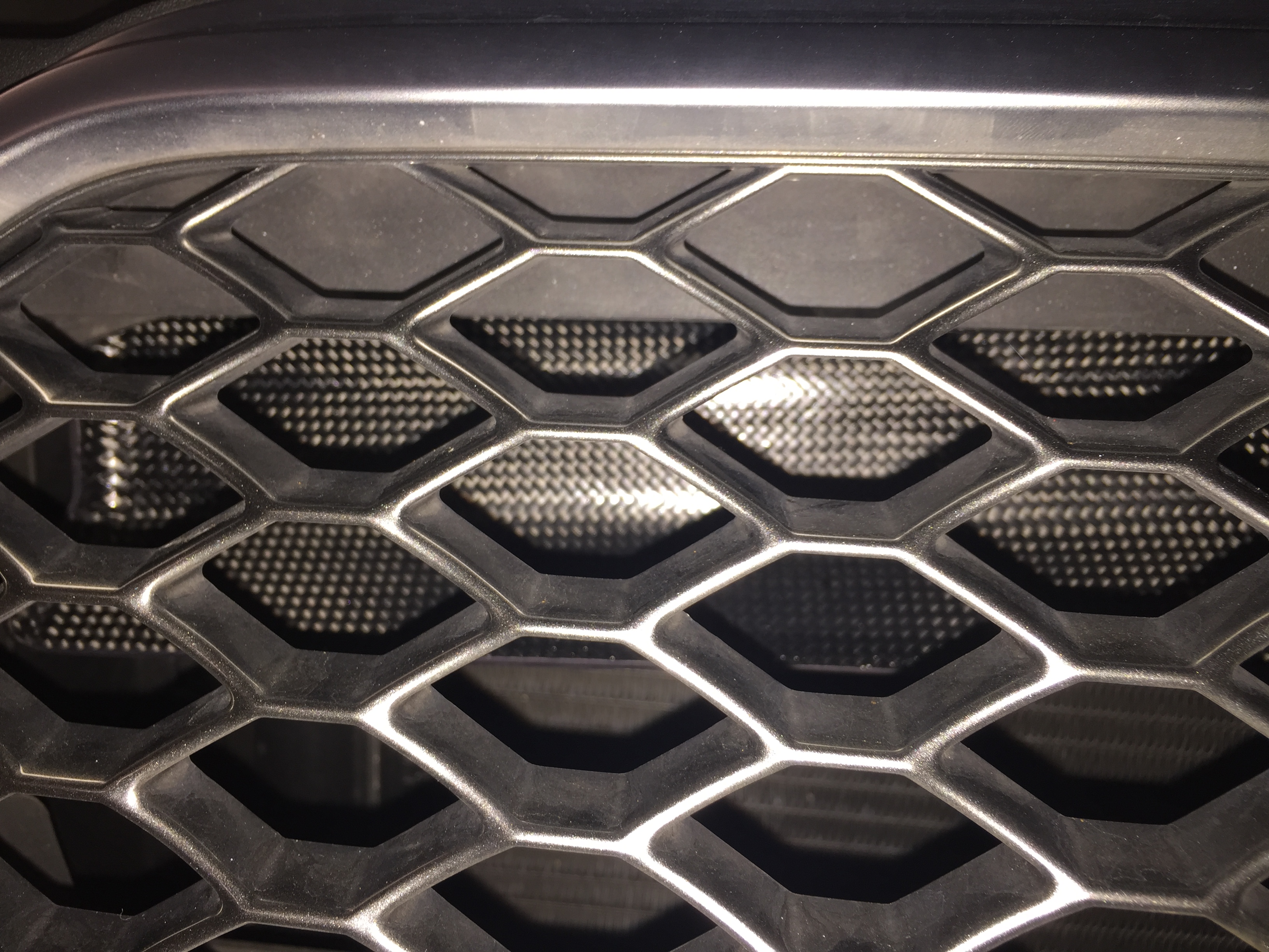 Stock Gruppe M It extends downwards and past the top of the front grill, I think for ram air effect. The centre section is blocked.
