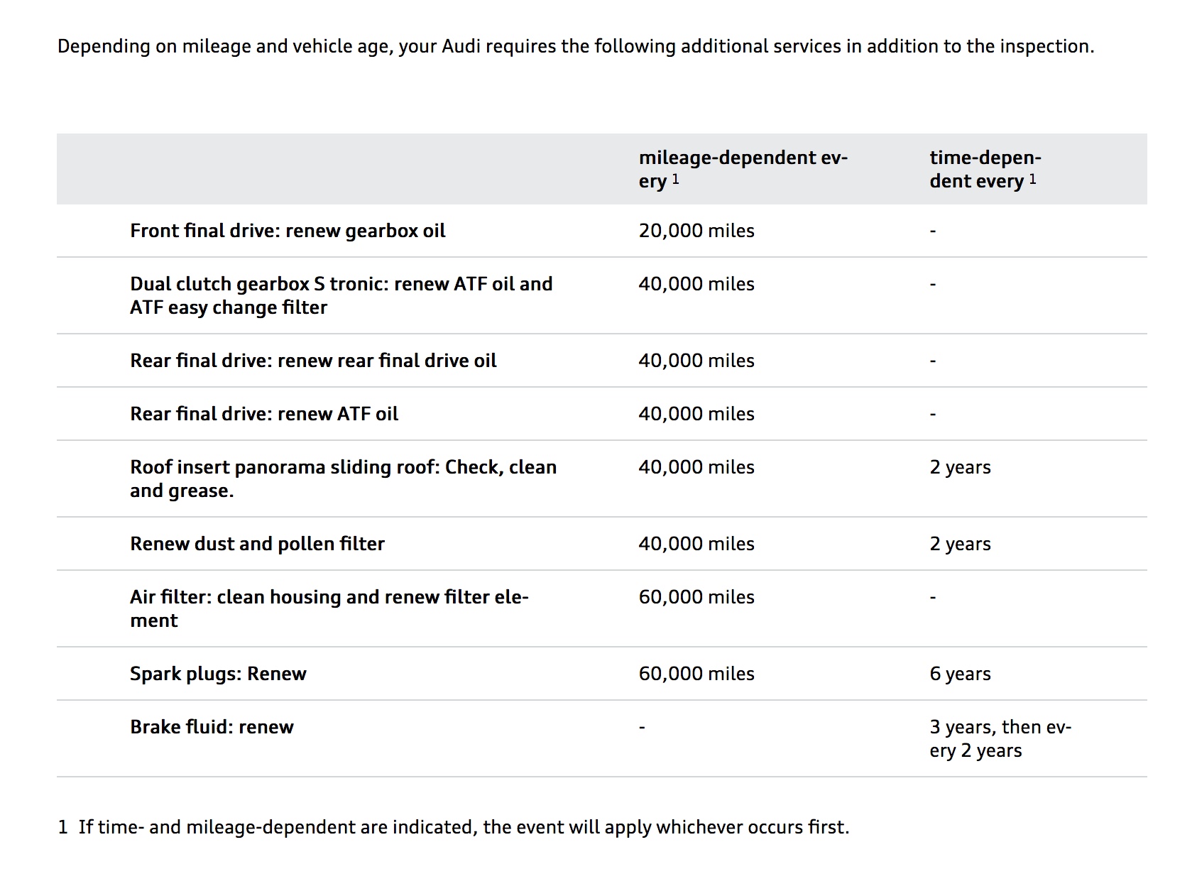 Here is Audi's service details laid out from "My Audi", no mention of AC service. It's traditionally a 3 year interval for modern cars, I notice mine now may need it as the 3 yr old RS4 is not as cold as the 4 month old T6 so will get it done along with MOT and brake fluid change. get an independent to do the AC re-gas unless Audi have a deal on, my dealer is doing it for £49, a lot of indipendants not fill it up full as they don;t have the right equipment for the large pipework and AC system in the V8 engine bay, it take ore gas than nomal.