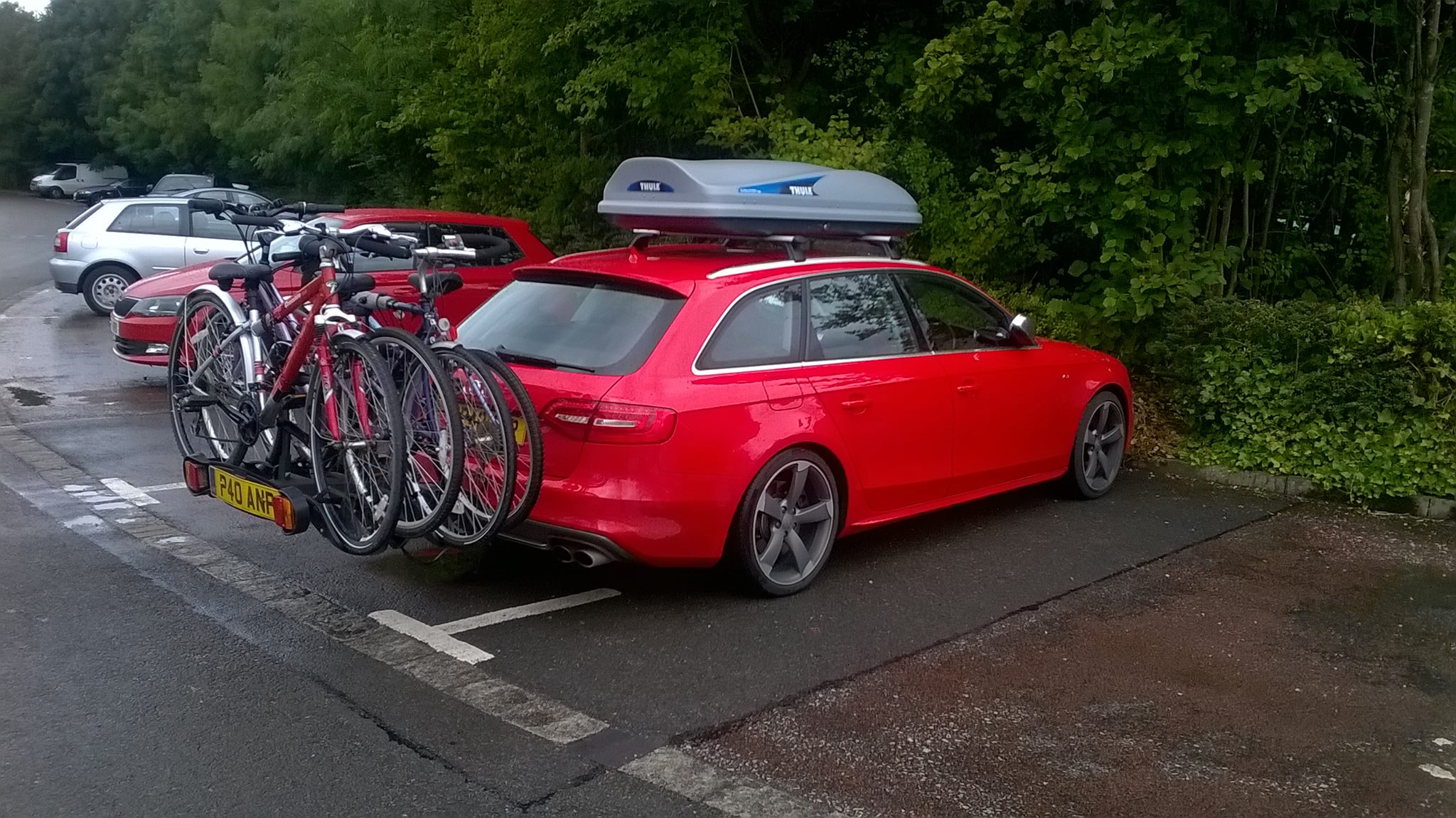 It's Misano Red with red/black heated Super sport seats, Quattro sport diff, ADS with adaptive dampers, MMI, Tech pack high, 19" rotors with good F1 Asym 3s, electrical opening tailgate, boot divider/load retainer, pale headlining, detachable towbar currently fitted but I can remove that if necessary - it's only towed a small camping trailer or hauled bikes around on a towbar mounted rack.