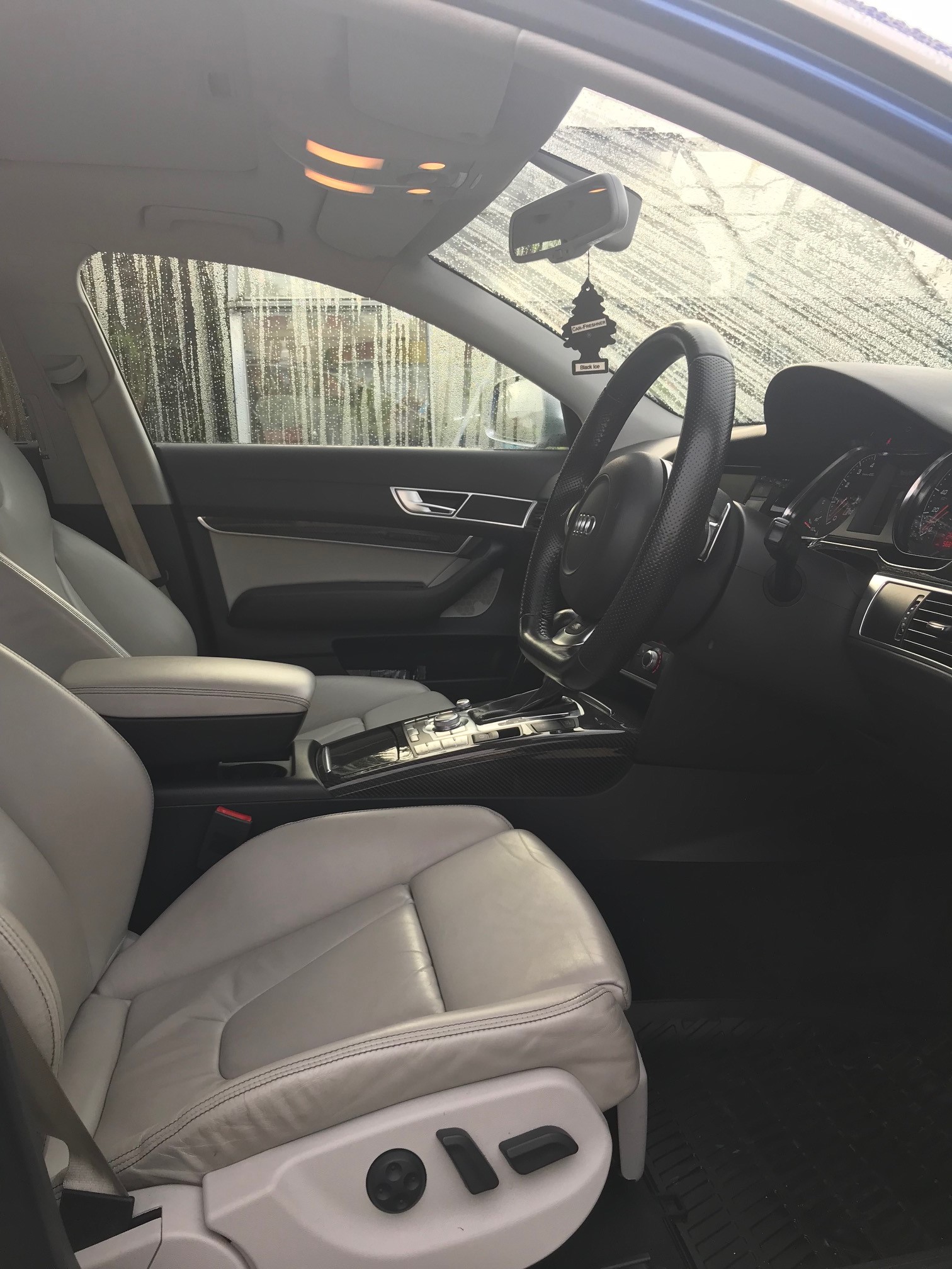 The interior has very light grey leather I think that it is call silver leather to the seats and door card inserts, with black dash, carpets etc.