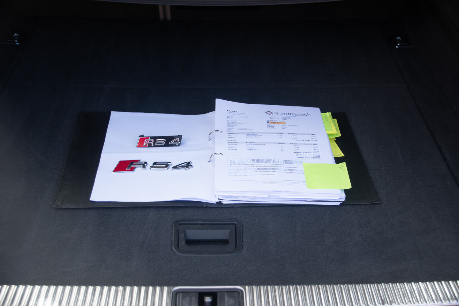 As can be seen from the pictures I have removed the front and rear RS4 badging (retained, and available with the car), and additionally the wheels have been powder-coated in a slightly darker shade of silver than standard.