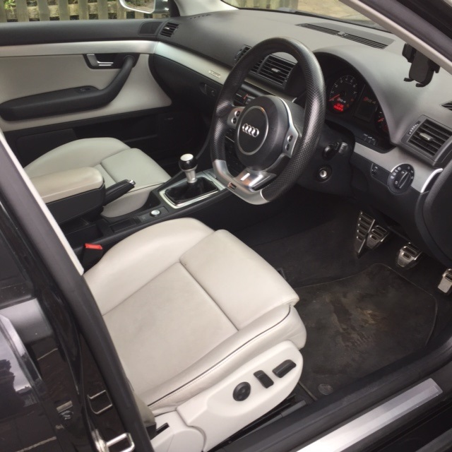 Car is black with a light grey leather interior piped in black, with Recaro seats (not buckets) and flat-bottomed wheel. Tints to the rear windows. Has sunroof, Bose sound system, rear window blinds, Audi-fit sat-nav, cruise control etc.