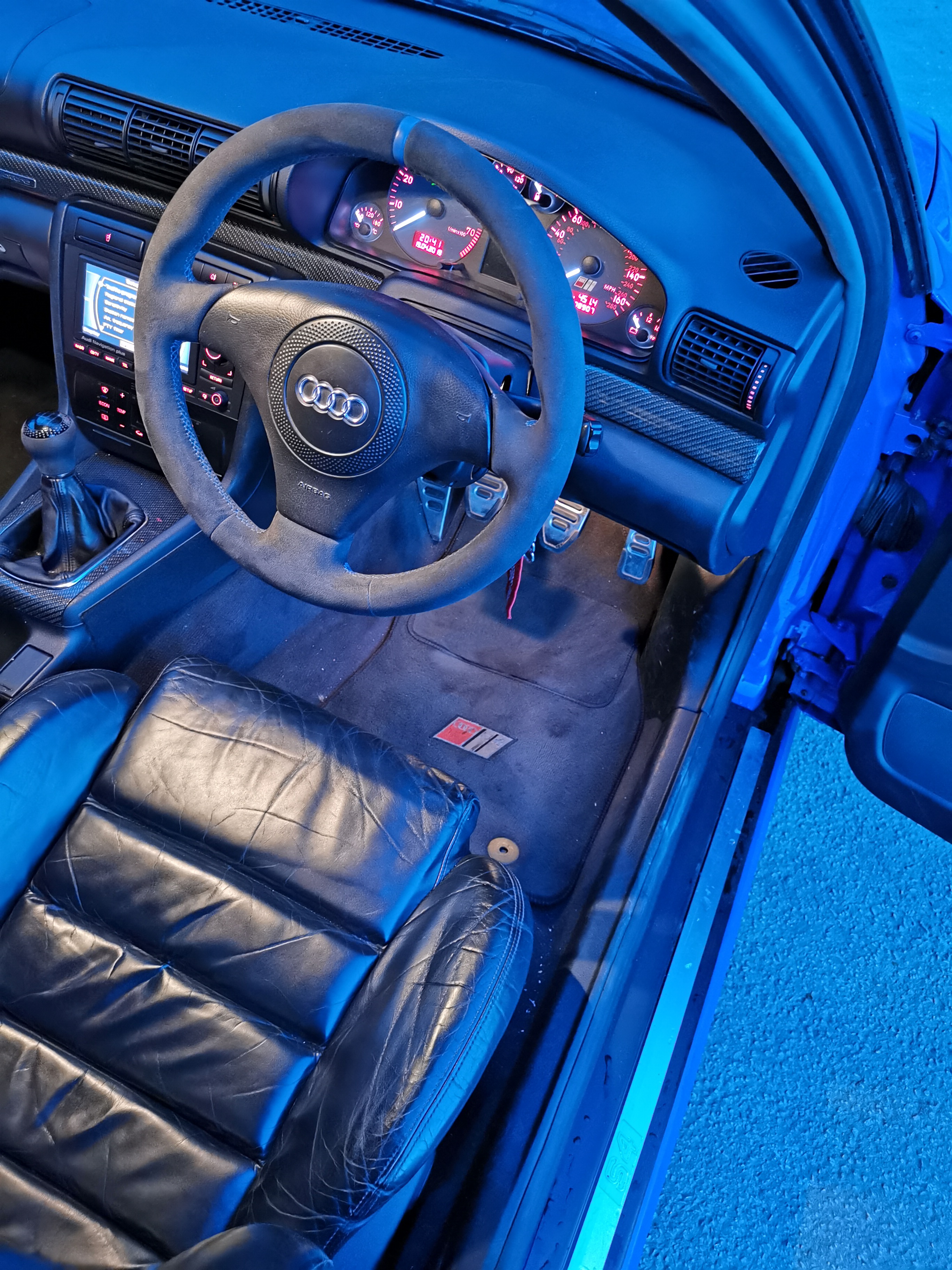 Steering wheel and gear knob re-trimmed by Royal Steering Wheels in alcantare with blue stitching and blue centre stripe