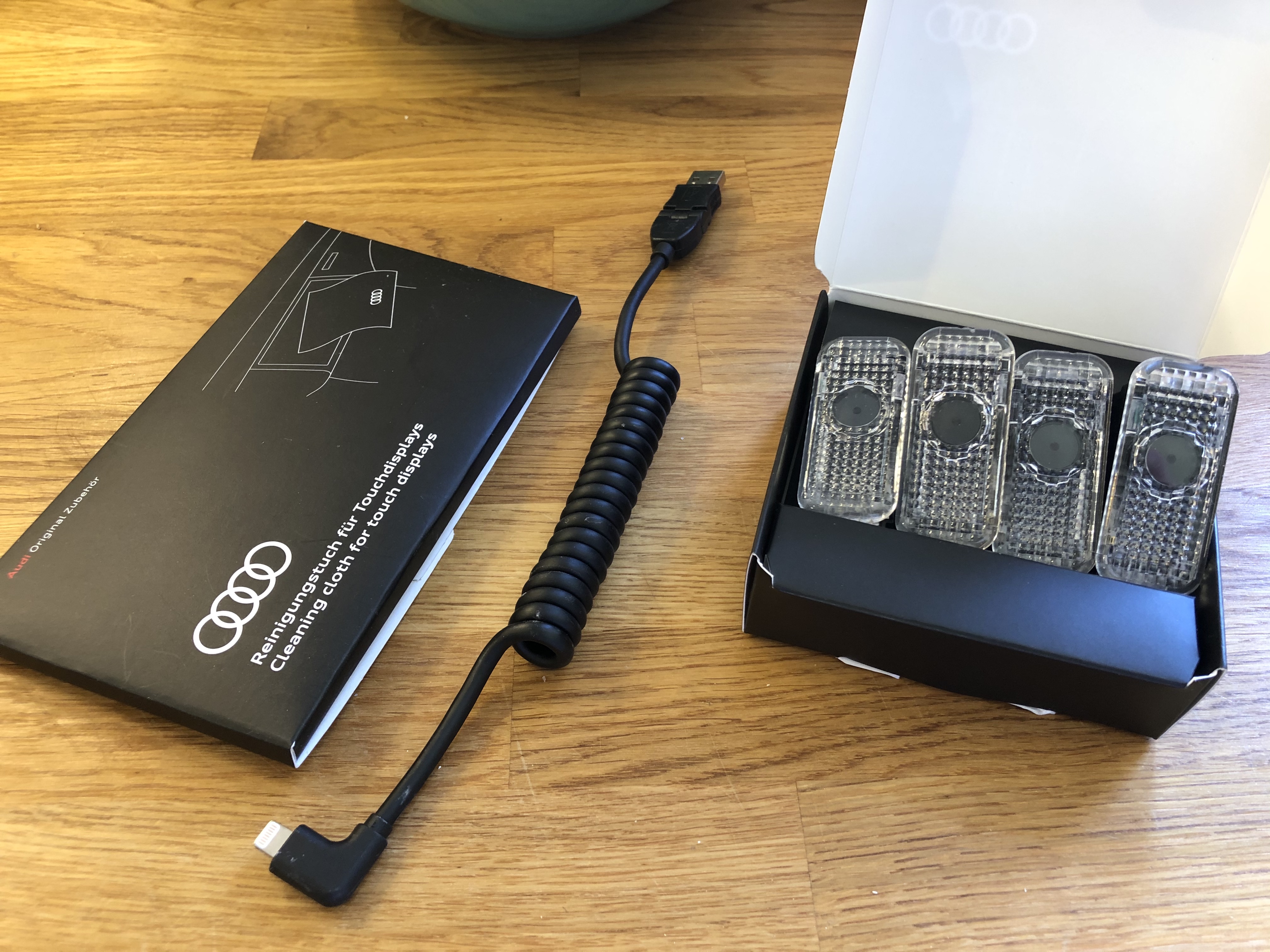 Set of 4 ring puddle lights, iPhone charger and heroic screen cleaning cloth.