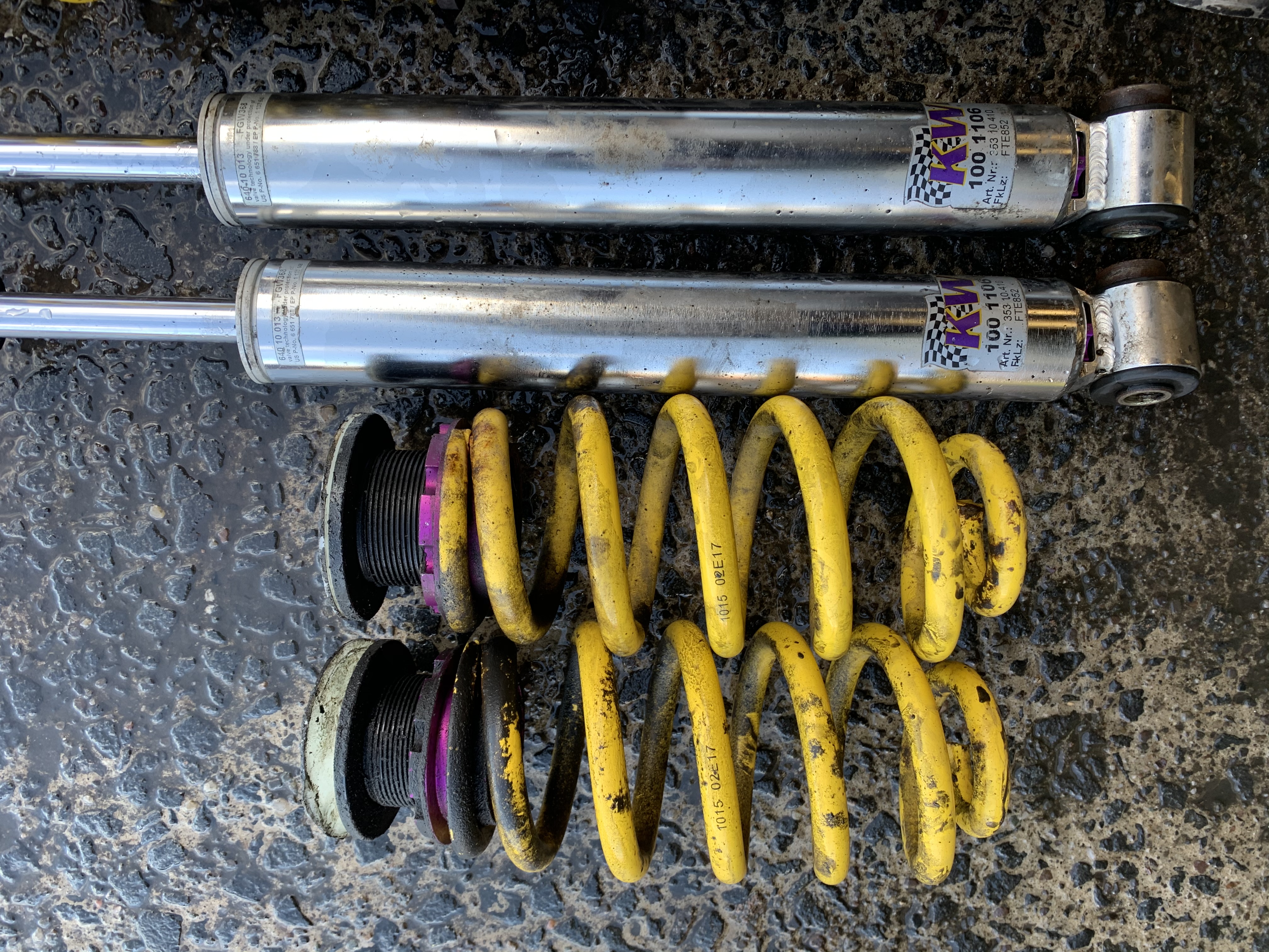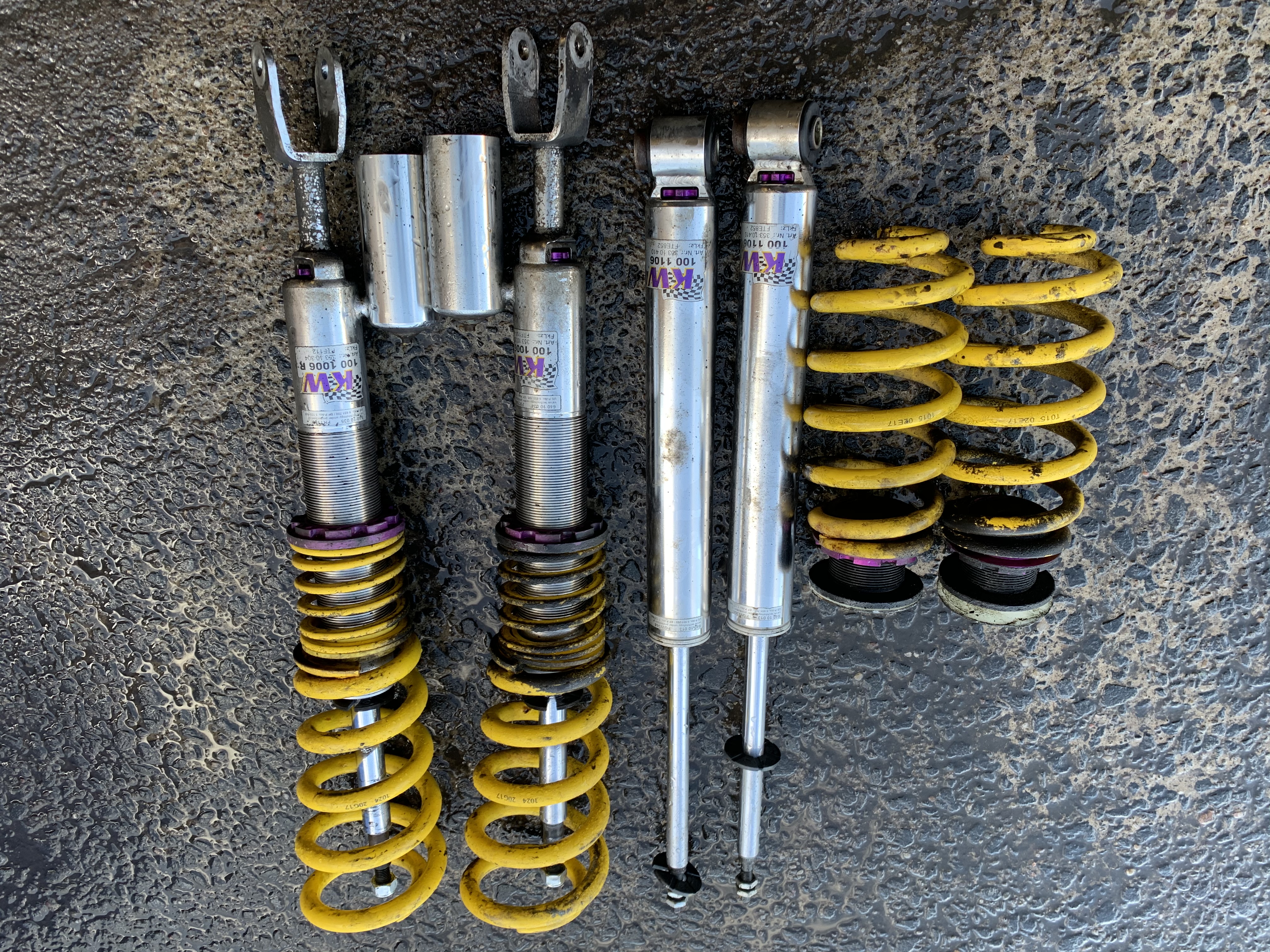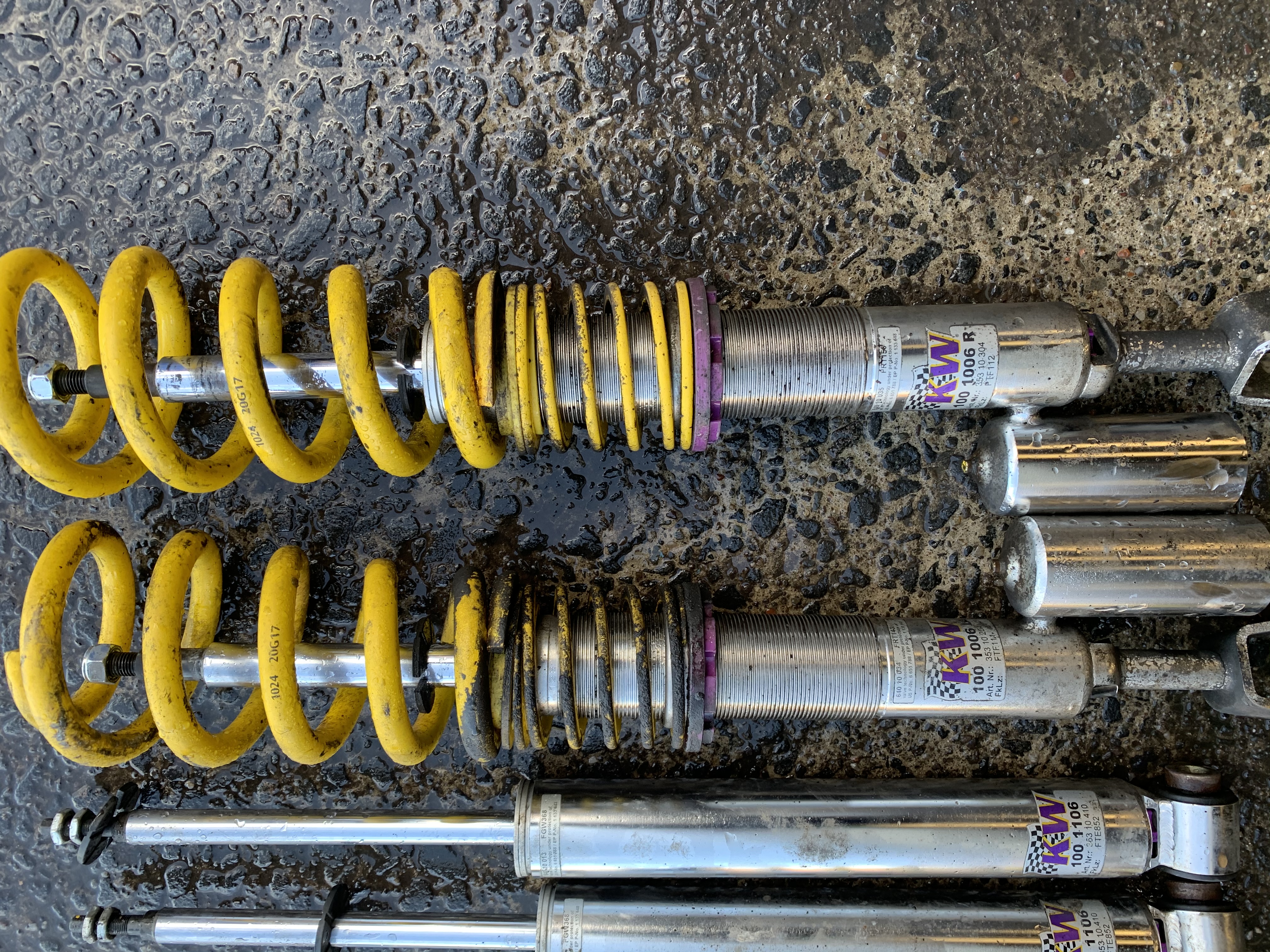 Hi guys, selling these KW V3’s for my RS4. Only around 2/3 years old. They are setup already for an RS4 to what my taste felt acceptable. The bottom bump adjuster is a bit sticky on the offside front shock but apart from that they are minted. Black marks on the parts are in fact just grease.