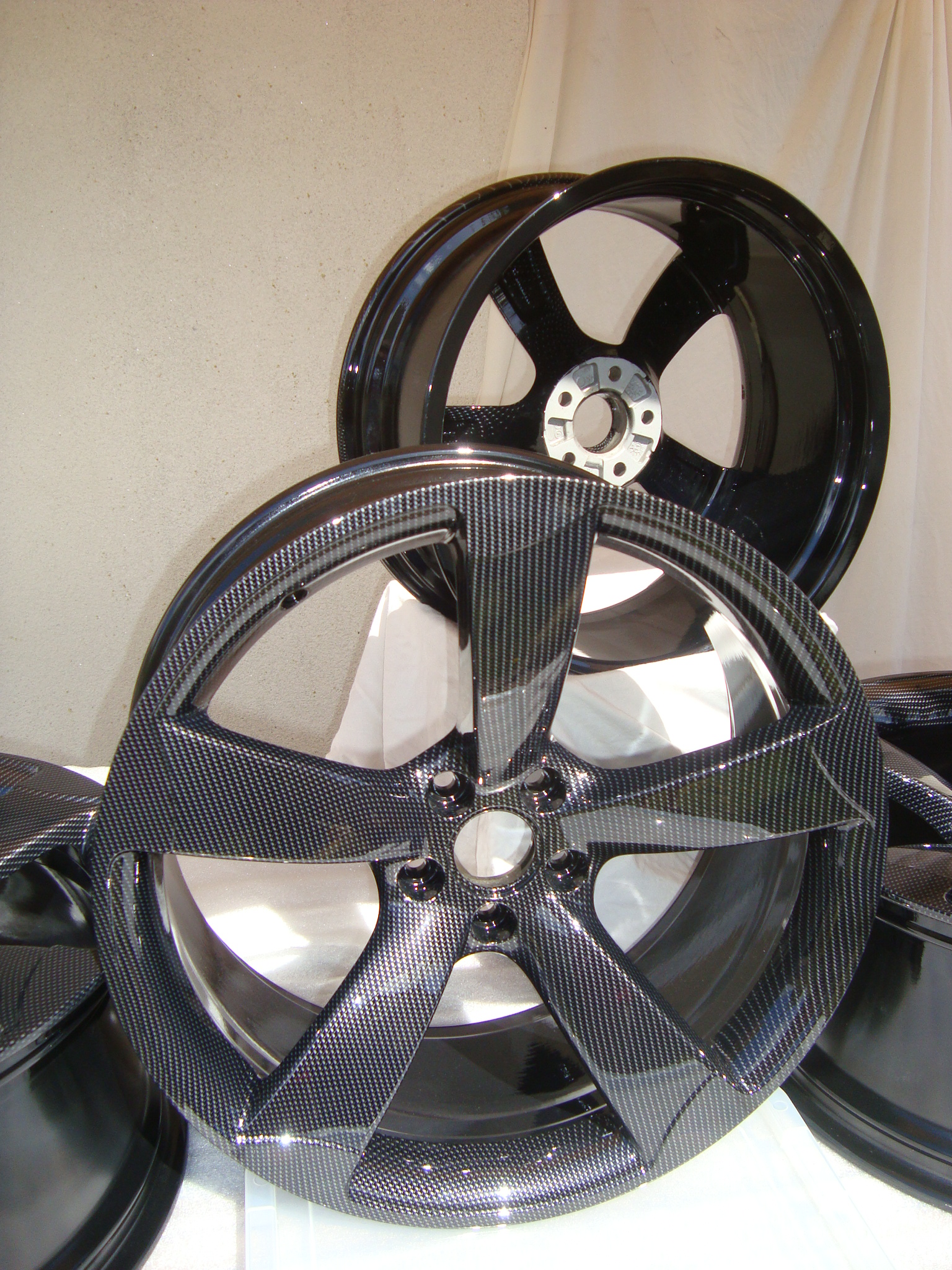 OEM [UK Spec] 5 arm rotor design alloys, fully black powder coated, carbon hydro-dipped and lacquered.