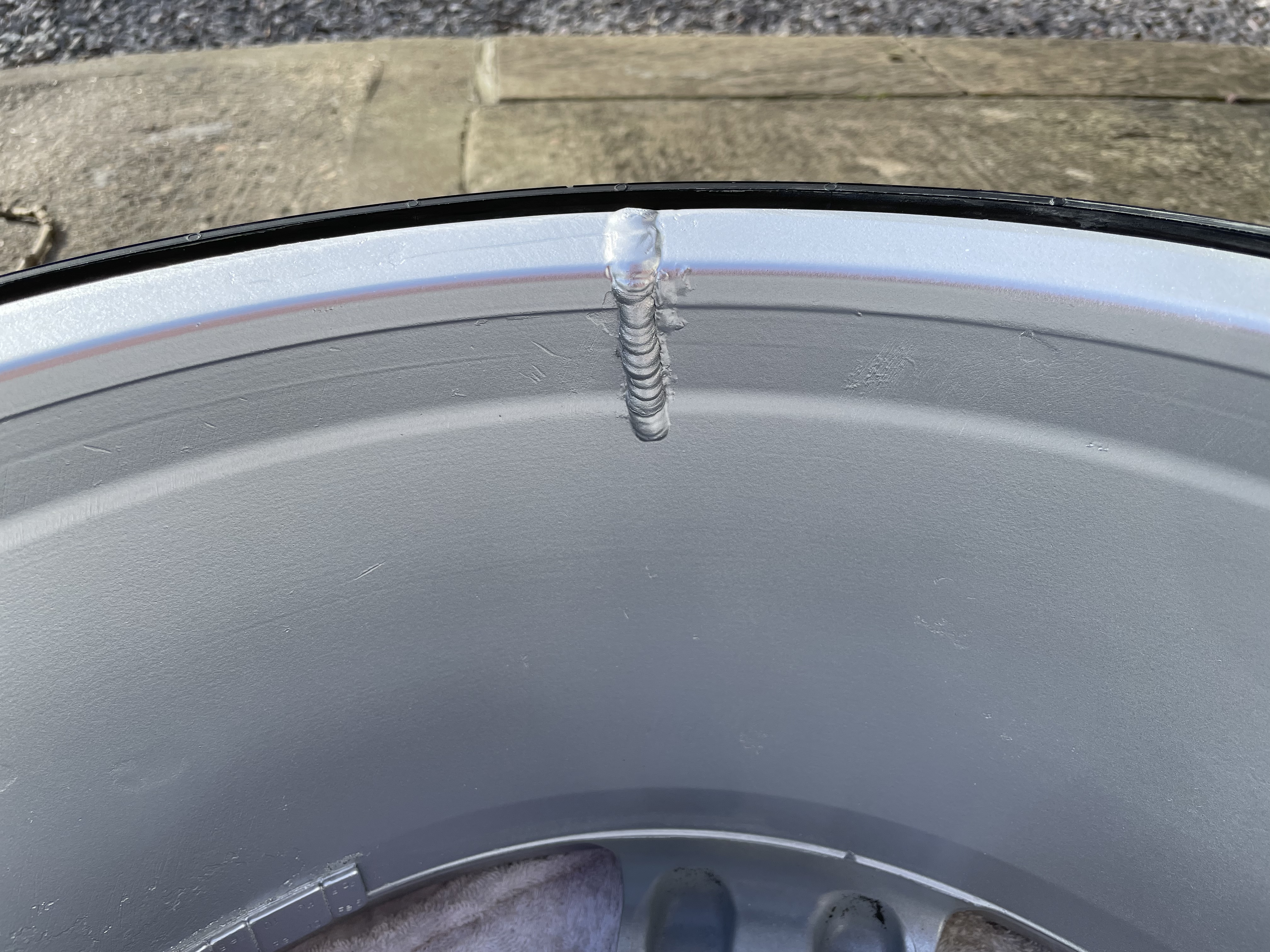 The wheel was cracked and welded prior to my ownership. Last summer I sanded the inside and put on a coat of Le Mans silver with lacquer just to make them look a little more presentable. They aren't perfect and have some kerb rash around the rim, but are in good condition considering the ouside have never been repainted. There is no centre cap fitted either.