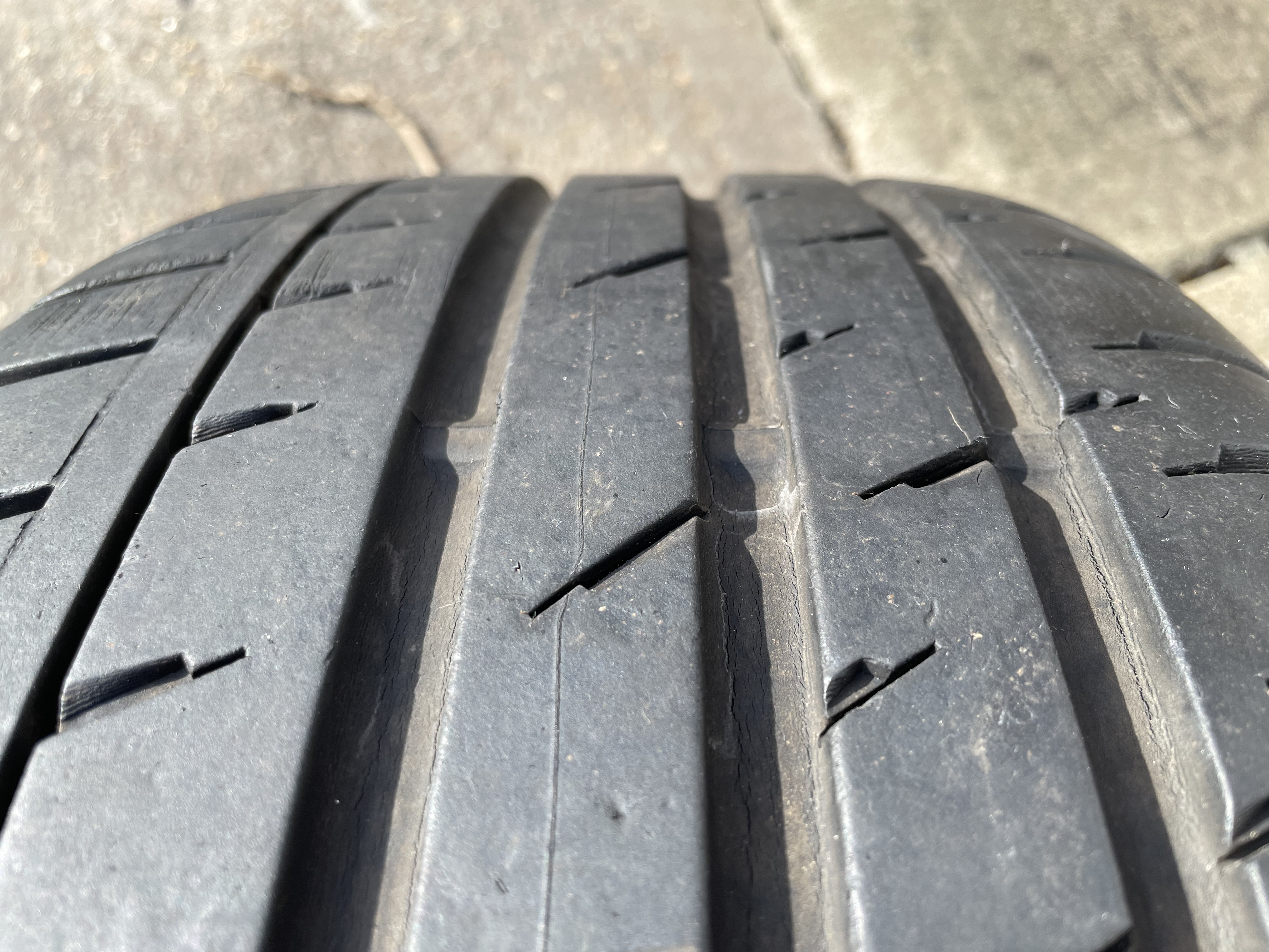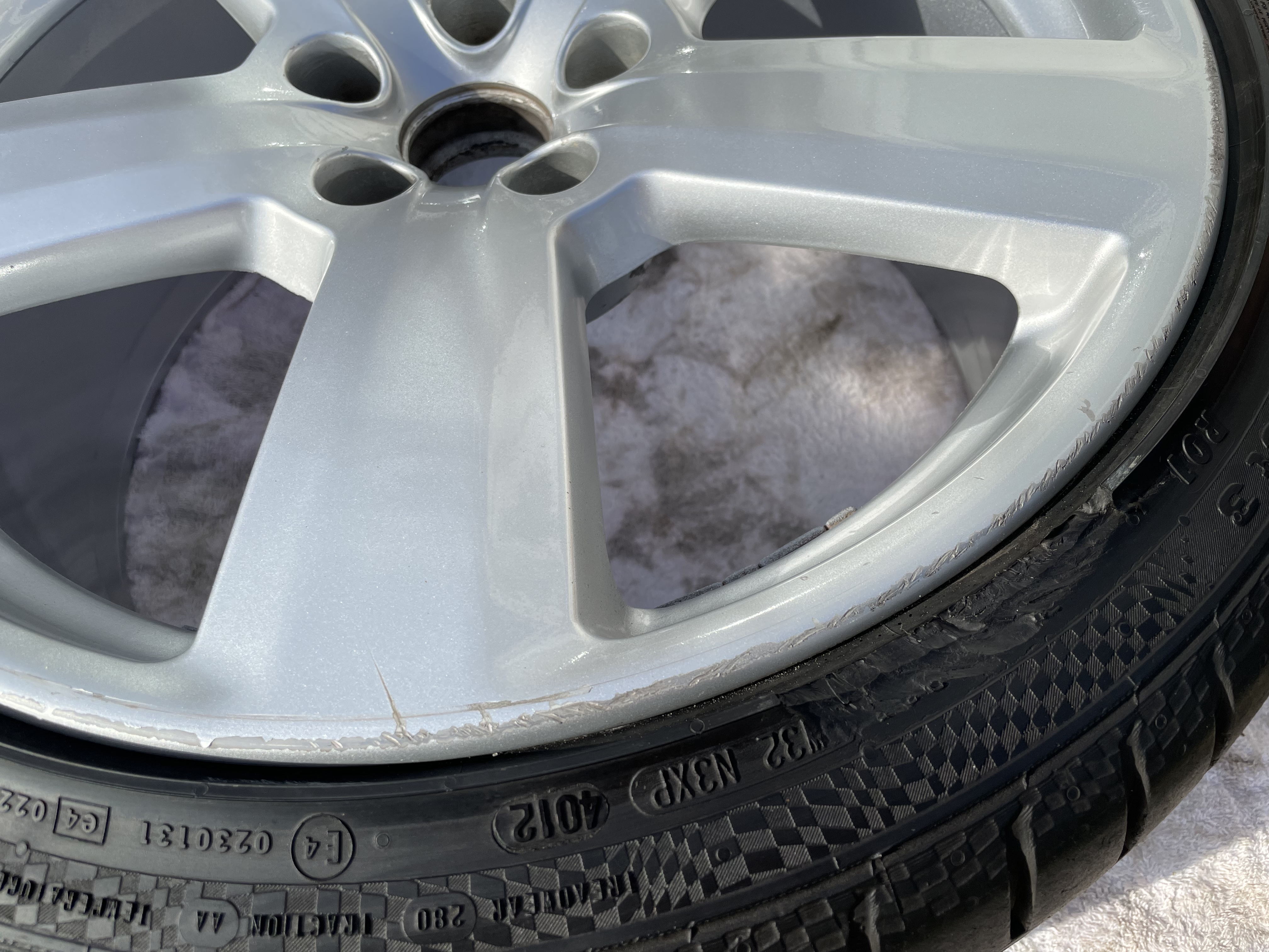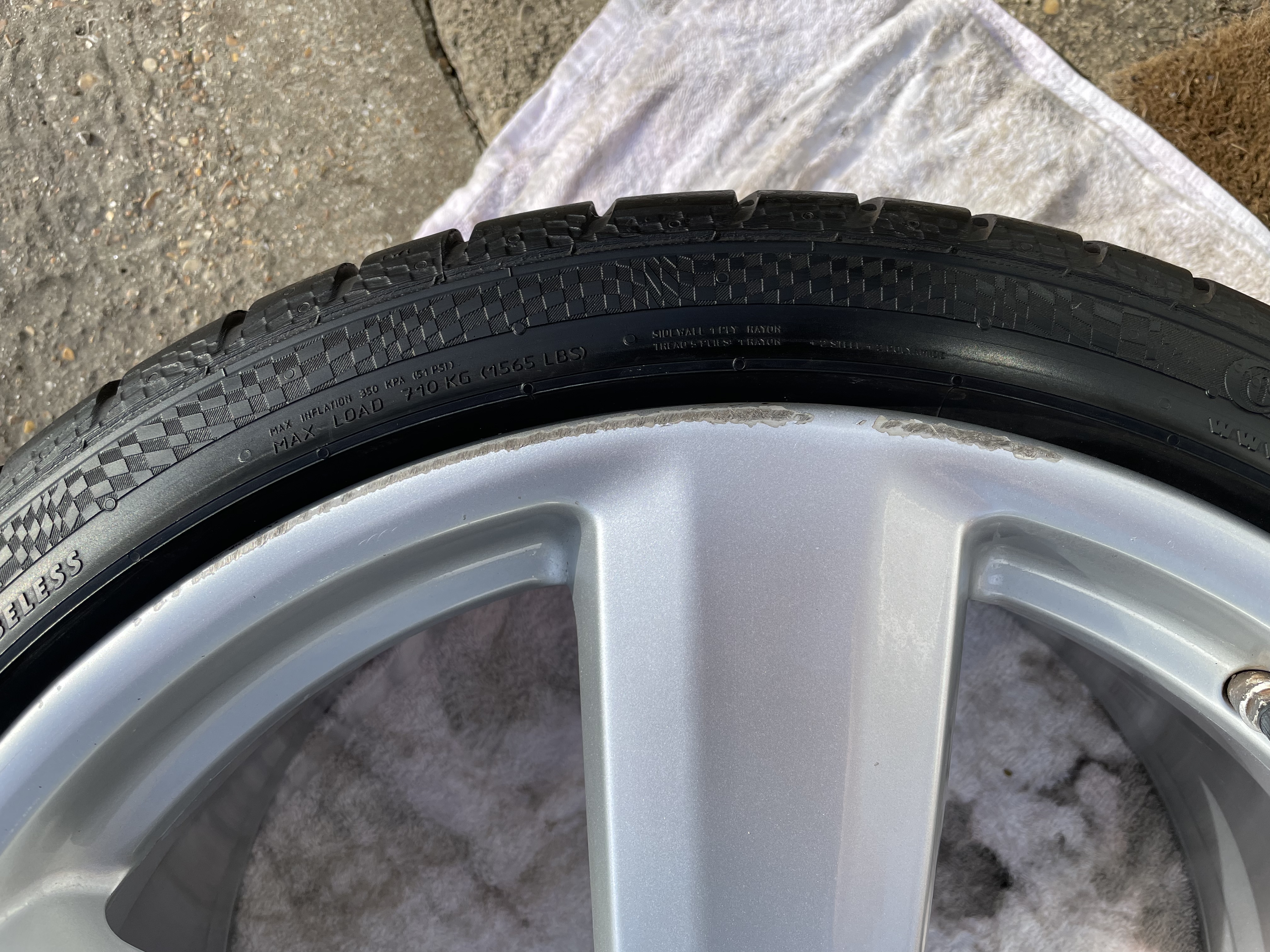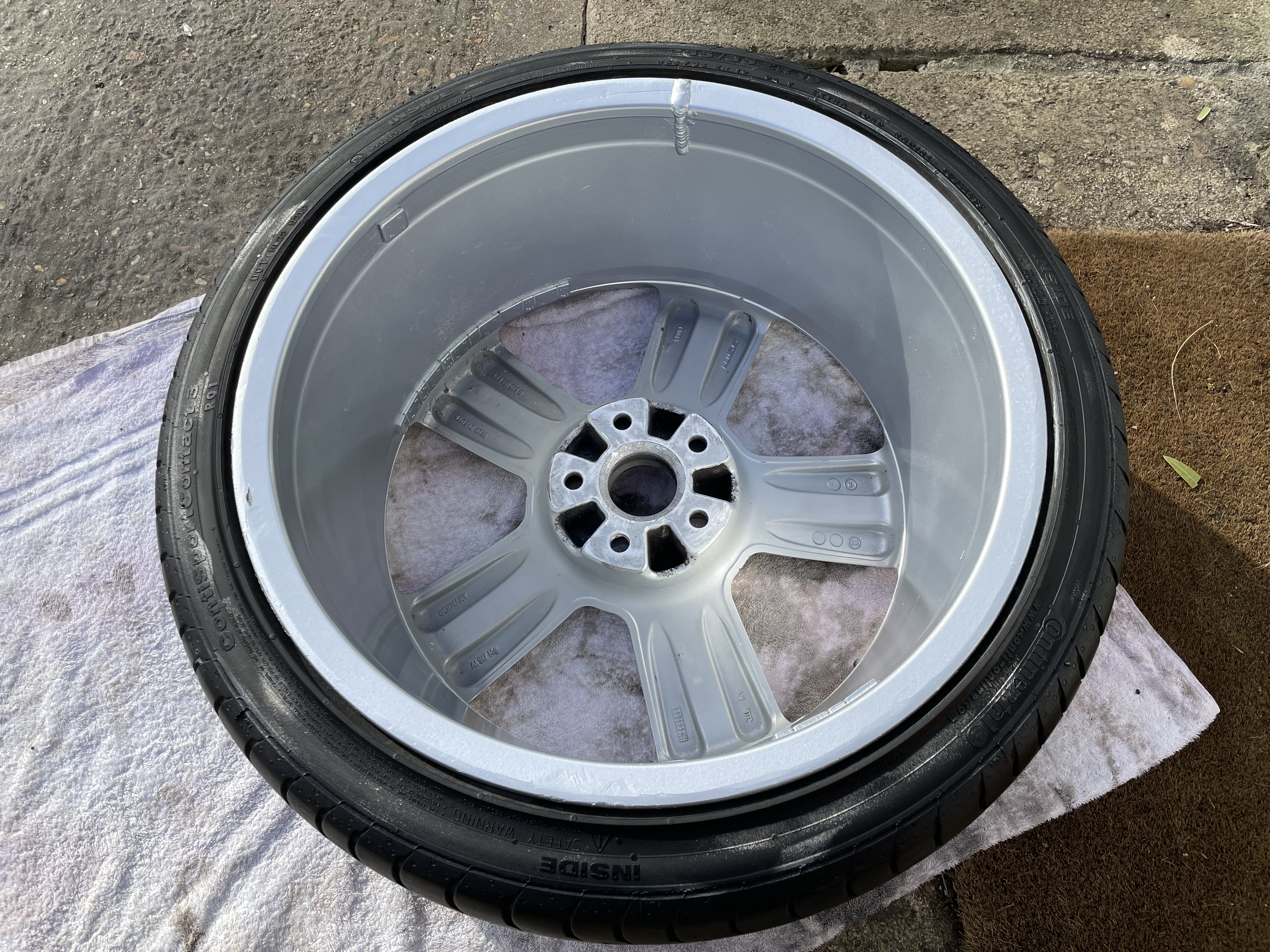 This wheel is fitted with a Continental Sport Contact 3 tyre (which I believe the RS6s came with from the factory), but they don't sell them anymore. The tyre itself has loads of meat on it 5+mm but has a gouge out of the side wall. It is still road legal though and has passed MOTs with the tyre.