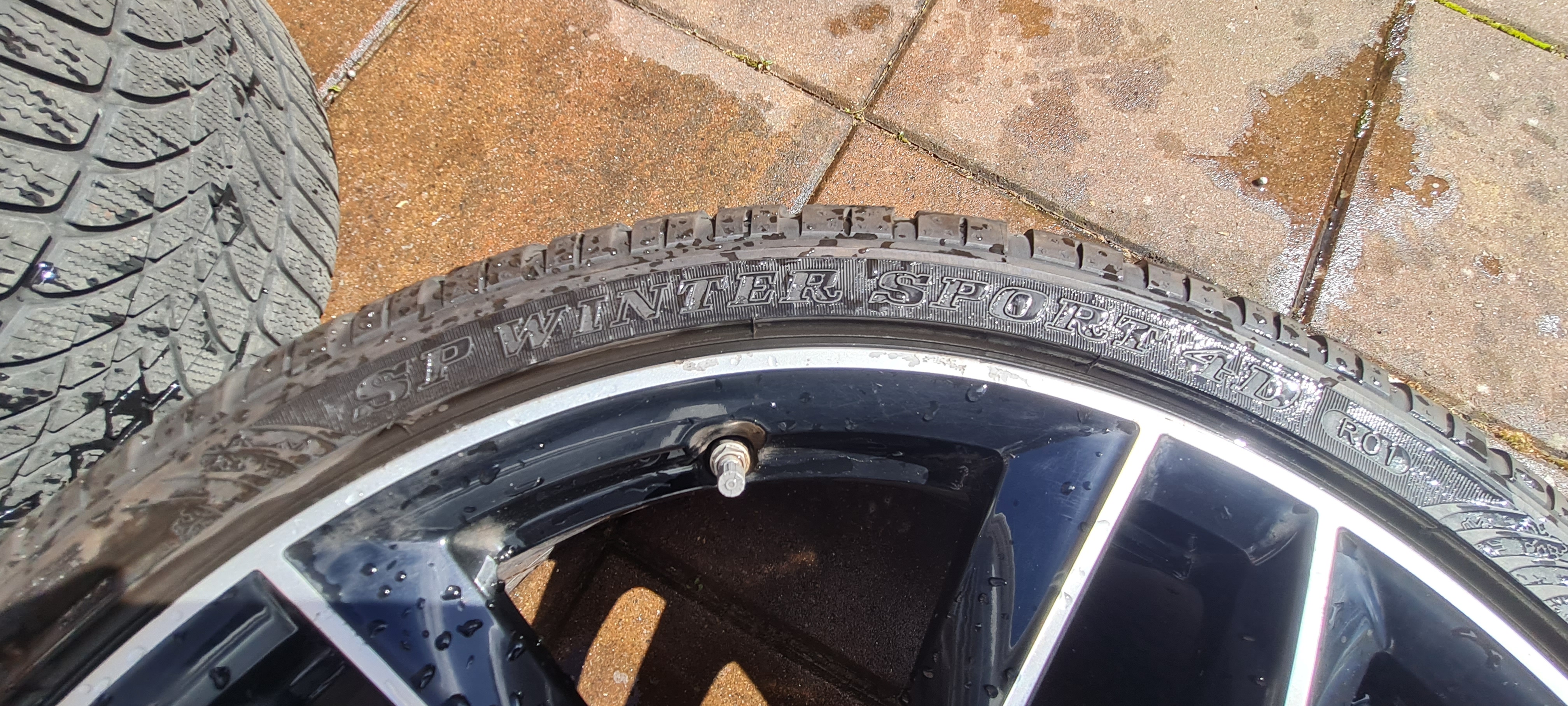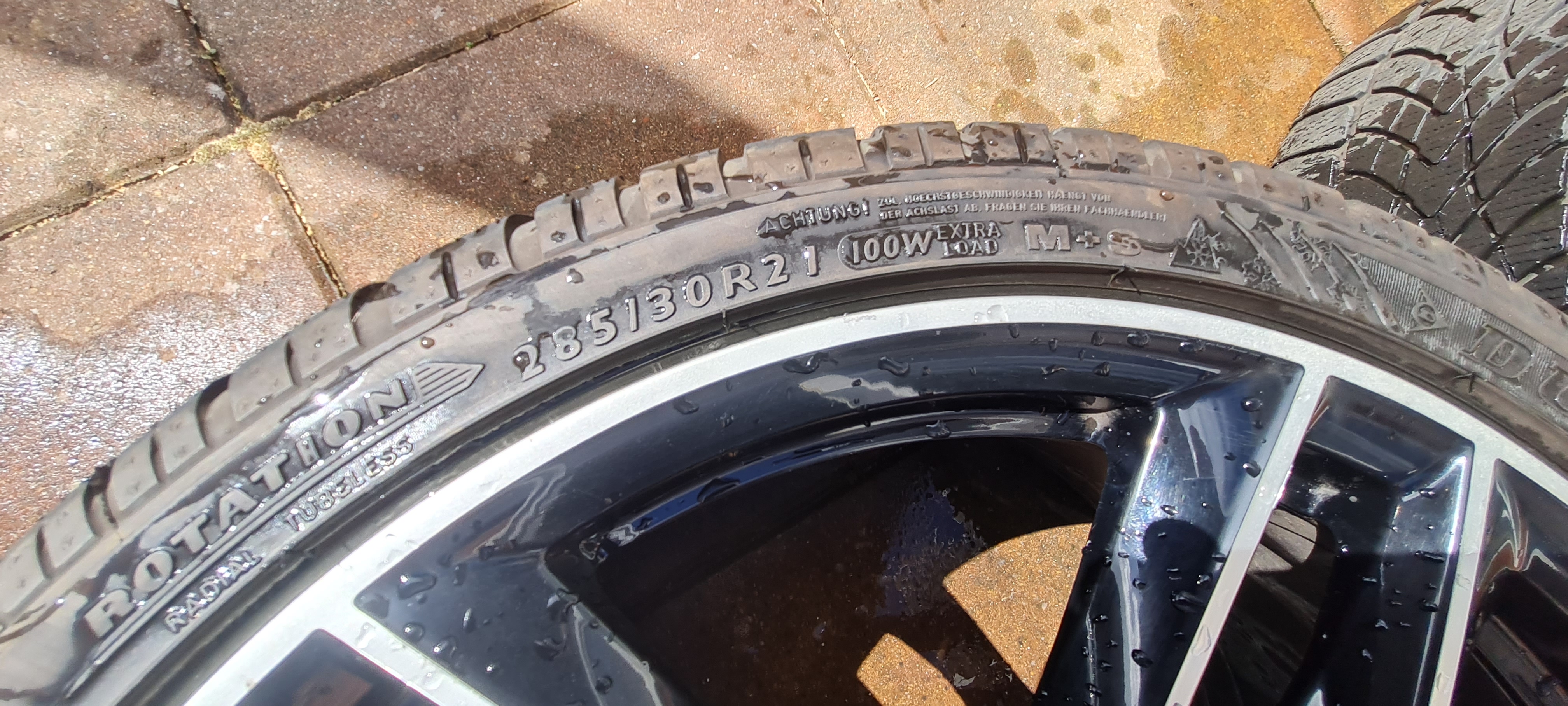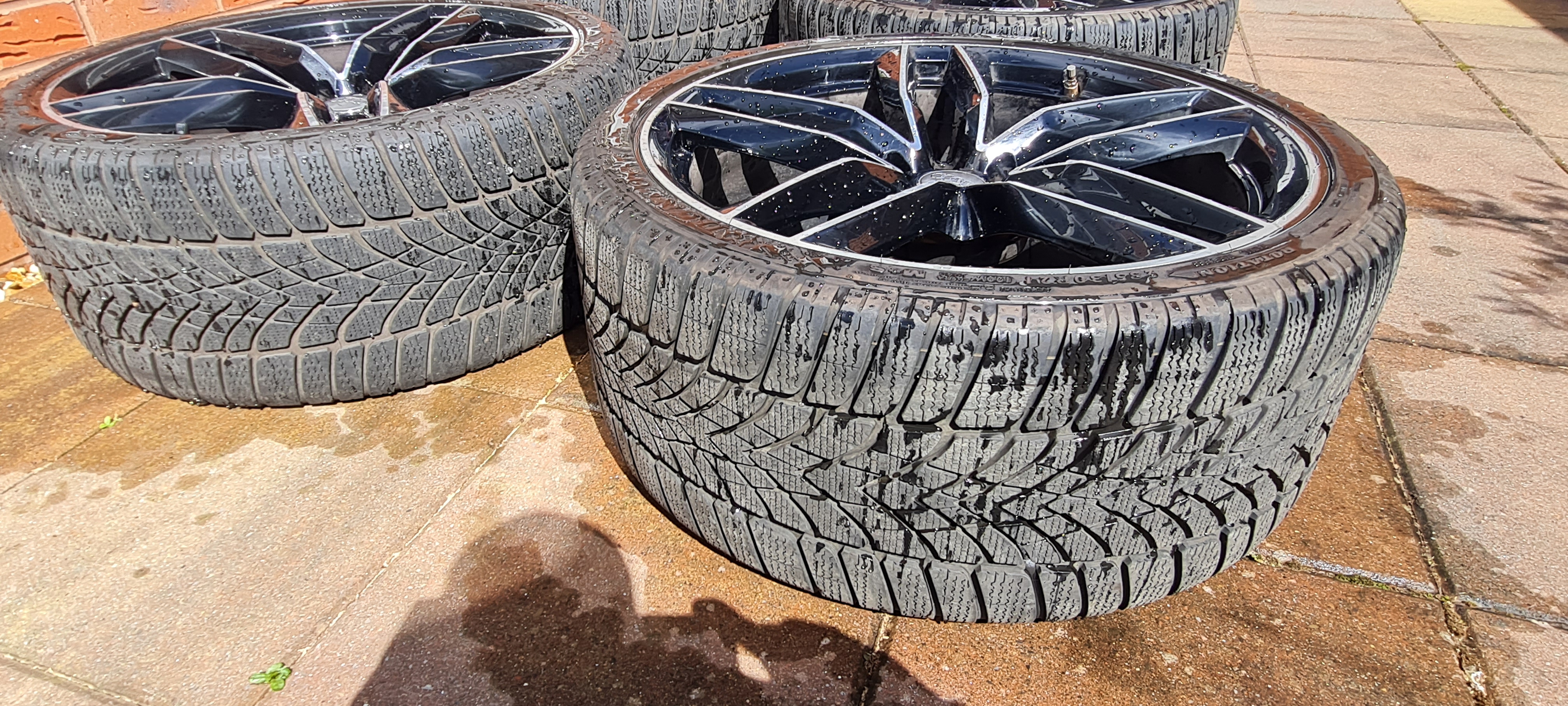 21" x 9.5 black with diamond cut face in very good condition. Wrapped in dunlop sp 4d winter 285 30 21, surprisingly good tyres with loads of tread.