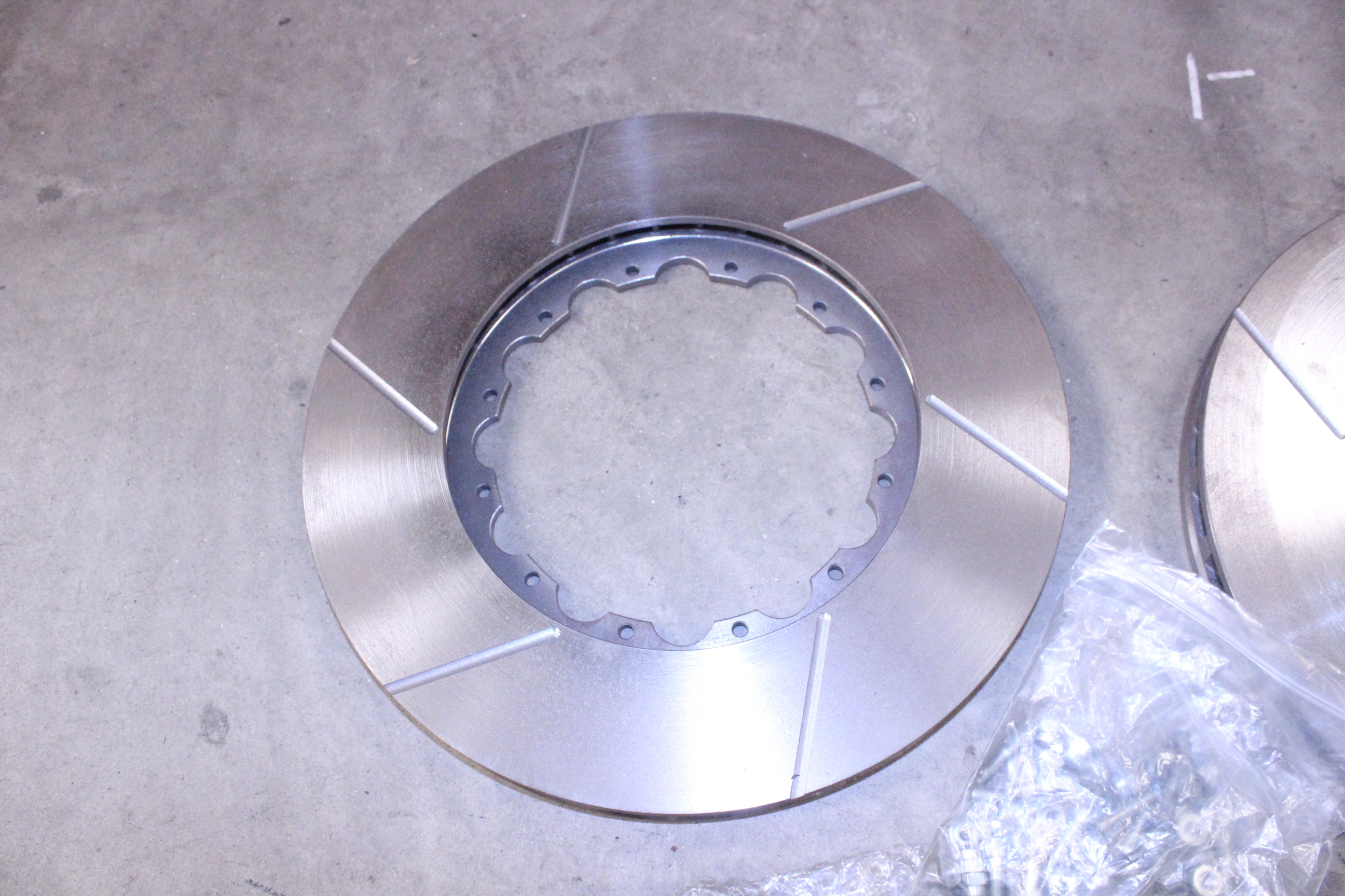 The discs are 345x30mm with grooves. The bell hats are Aluminium and come with fixings (bolts, washers and locking nuts).