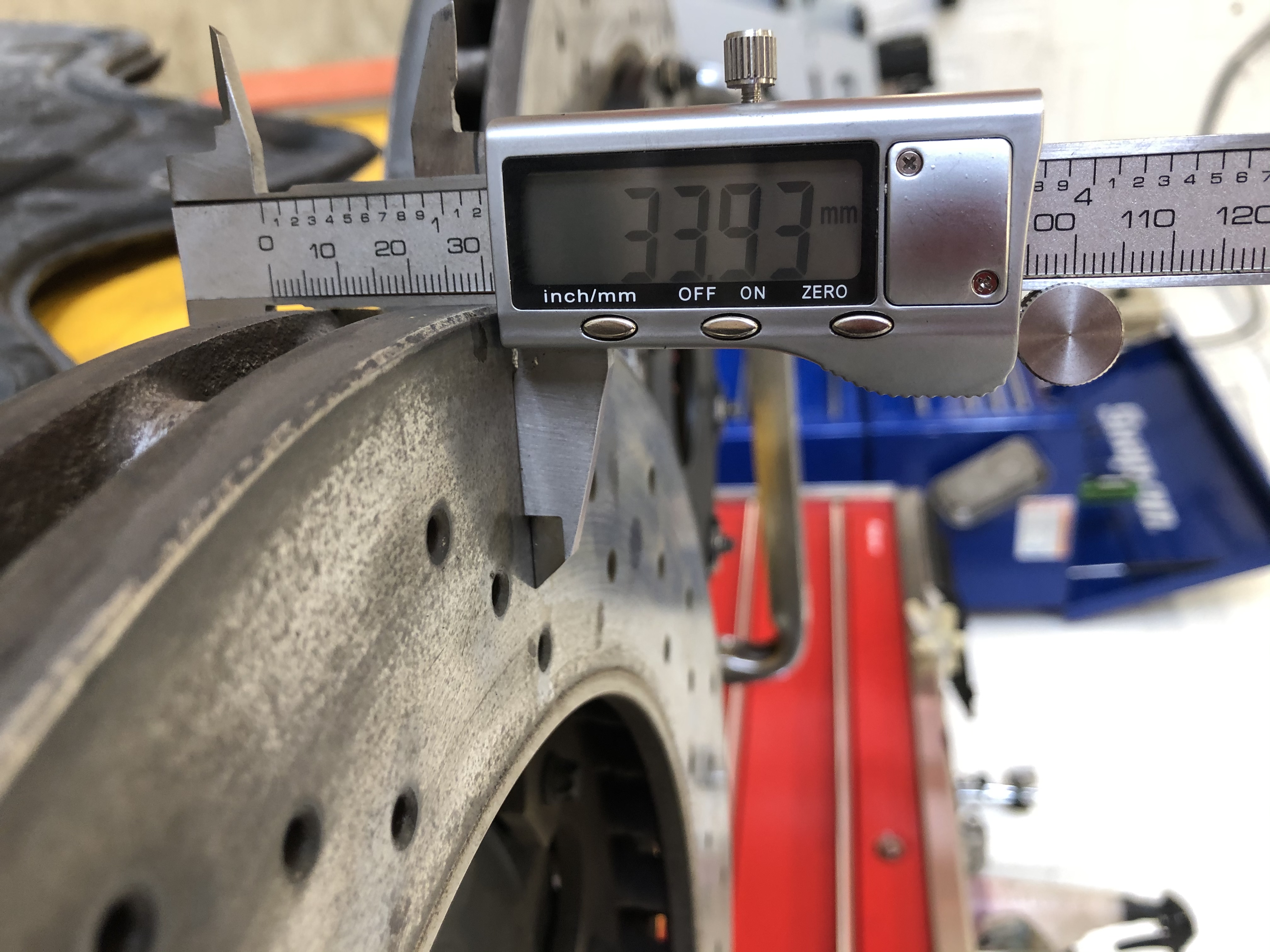 The surface rust is where they have been stored on the bottom shelf of my parts store over the winter, and the 0.1 mm difference in thickness is due to have one face skimmed due to a slight judder. However, there was a small brake judder after this. So they will need a skim, but the wear is almost zero and thickness is almost as new.
