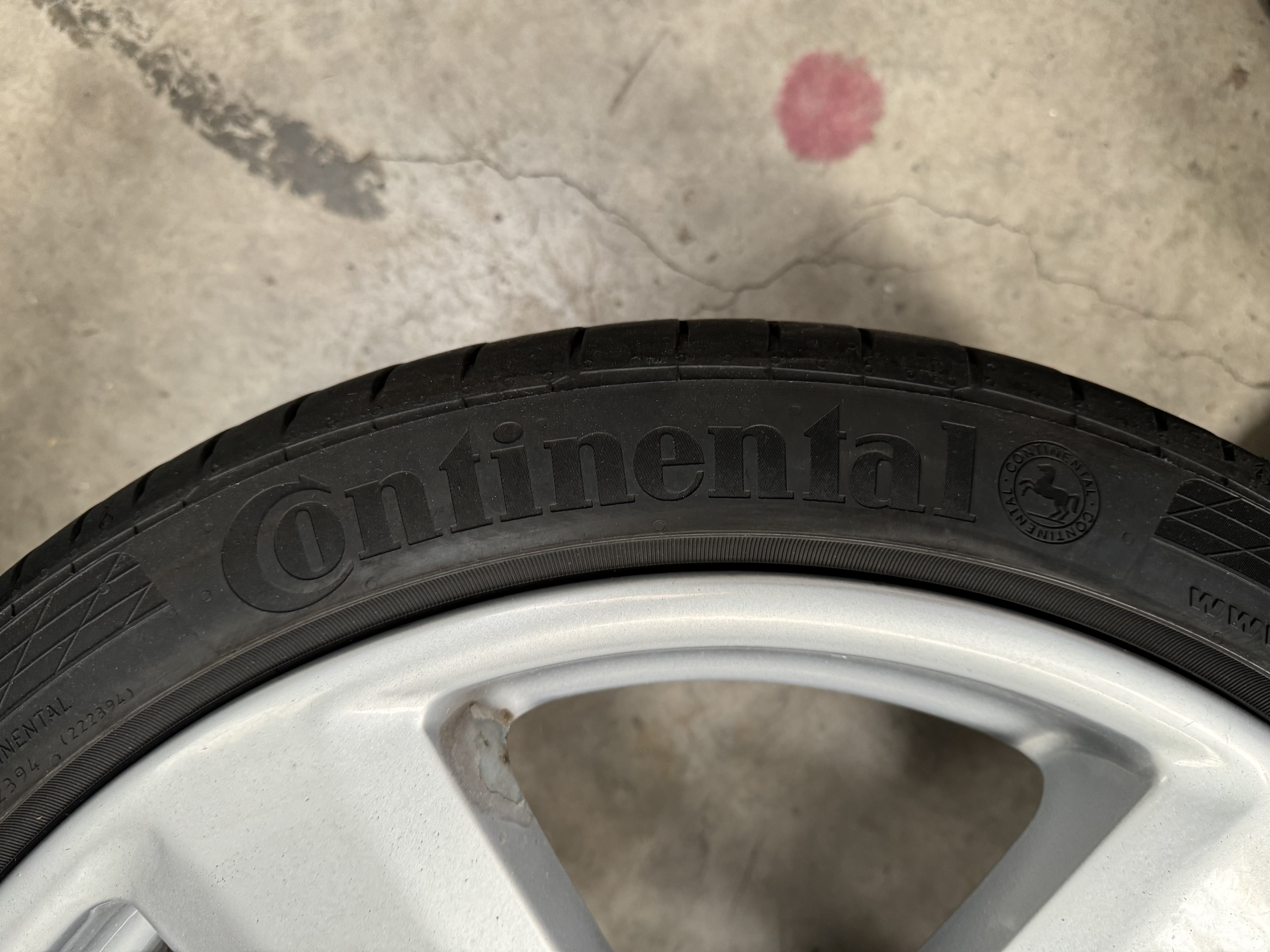 They come with 2x Continental ContisportContact 5P and 2x Vredestein Ultrac Vorti but one of the tyres has inner wear and needs replaced, one of the other tyres has a couple of chunks out the sidewall, still holds air and has decent tread but overall I would recommend tyres need changed also, you can decide to keep any of these as loose spares as they still have decent tread on the other 2 also