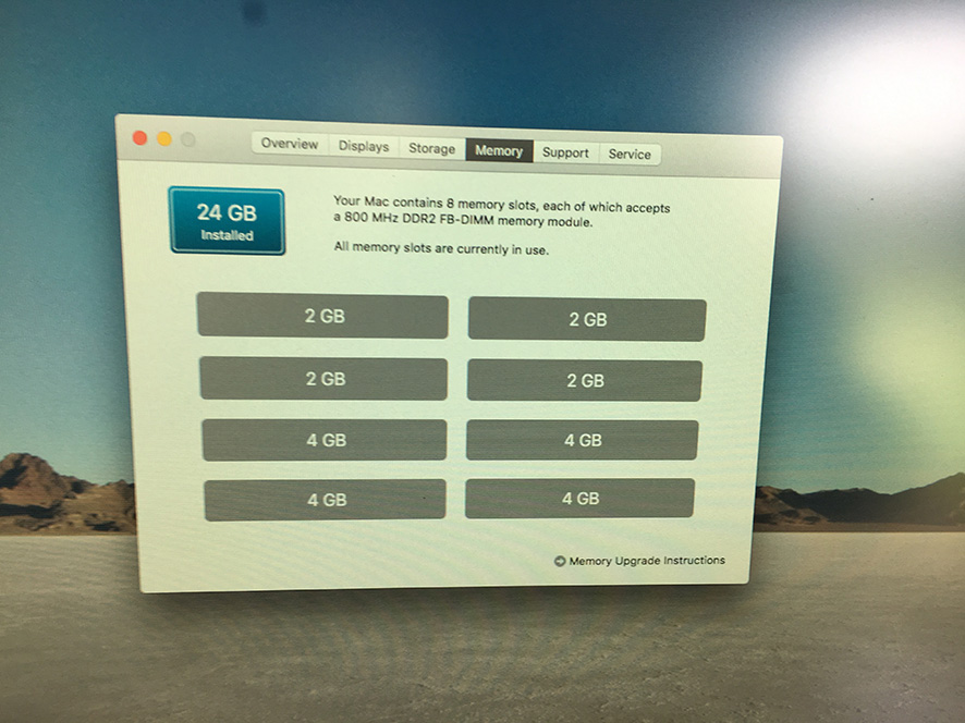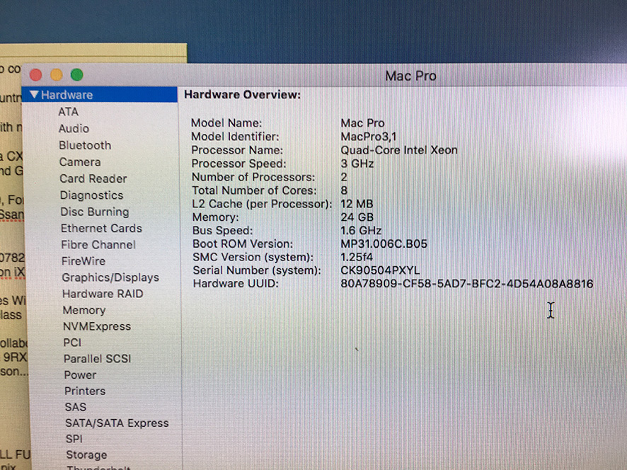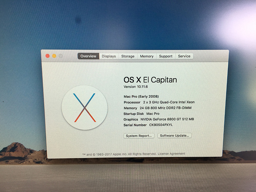It's a MacPro 3.1 (early 2008 model, and bought new in ’09 for a cost of £3,000). Processors are 2x 3Ghz Quad Core Intel Xeon and is currently carrying 24GB of RAM - it can be expanded up to 32GB. Currently running OS is El Capitan 10.11.6