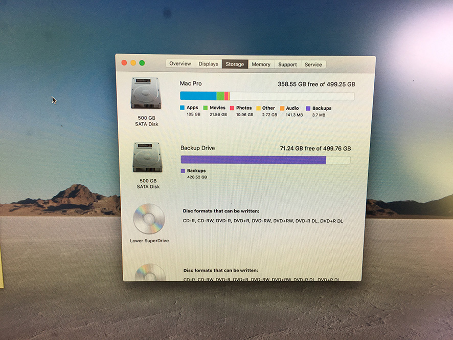 There are four internal drive bays and two are fitted with 500GB spinning disks. One is being used as a Time Machine backup while the other carries the OS. Just open the side panel and slot in the drives - it's simple. Will accept SSDs too, using drive bay converters.