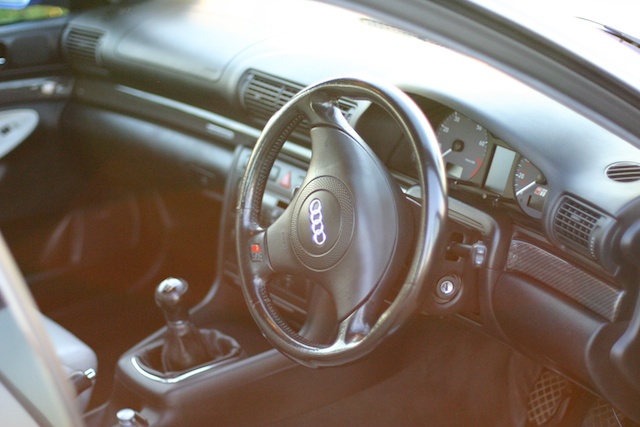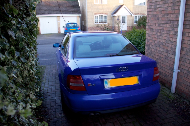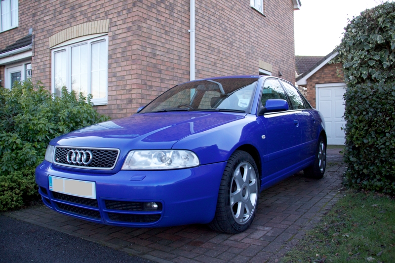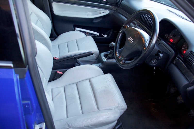 Bog standard Nogaro Blue B5 S4, silver grey leather & door inserts. Bodywork in good nick aside from: a noticeable stone chip on the front of the bonnet, and the door handles seem paint-averse. Other than that, it's had a good life and I think both exterior and interior condition attests to that.