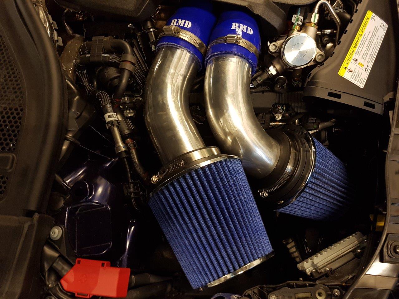 I have today mocked up an induction kit for the 4.0 TFSI on my 2016 RS6 engine based on the information from K&N filters and there flow rates based on the standard airbox and filter, I have made this using 2 480cfm inverted filters and 76mm pipework as there stock direct replacement is only capable of 308cfm free air flow yet the standard RS6 engine can easily consume over 600cfm. I have for over 16 years specialised in high power turbo engines and after this mock up I will be posting direct internal of the filter induction temps live as I drive my car in real time situations so please keep an eye on this thread for updates.
