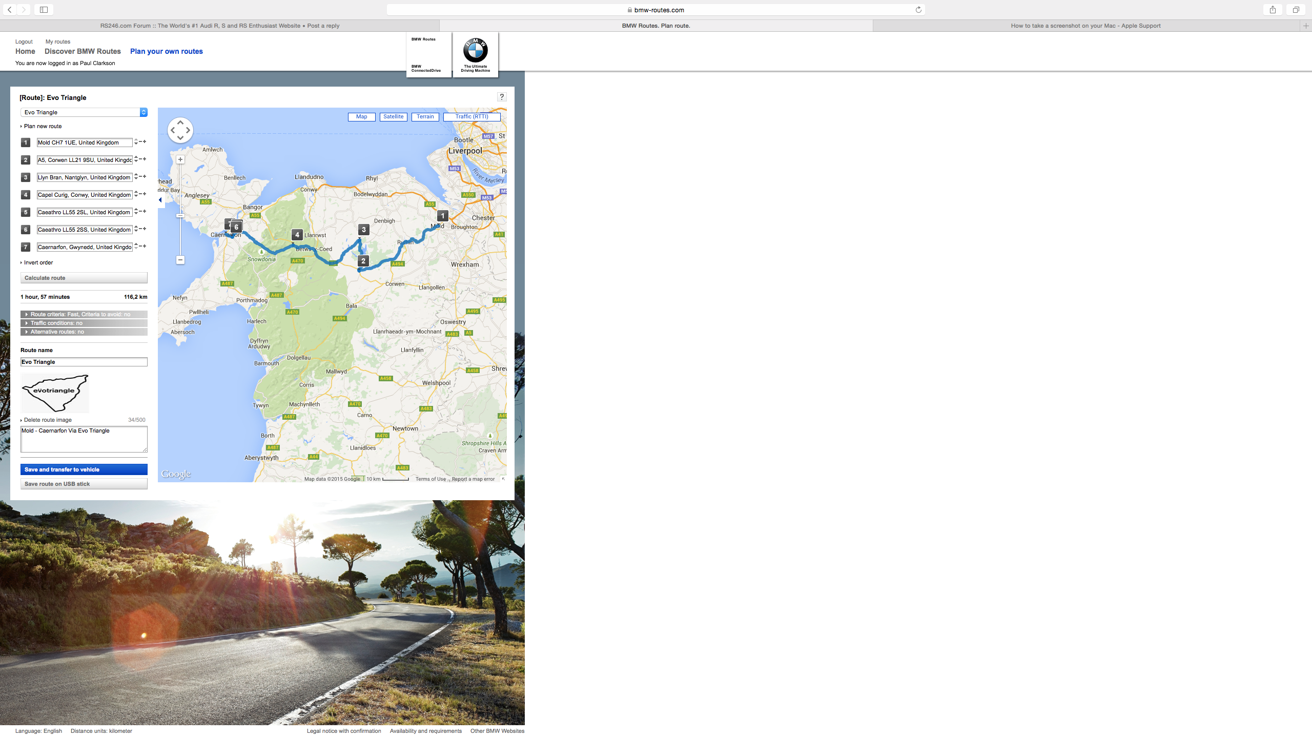 A route is created in BMW Routes which is overlayed onto Google maps, you select the various waypoints (no idea of their is a limit) & then send the route to the car. Once in the car you go into Nav & select 'My Routes) & in their is the created route. See screenshot below.